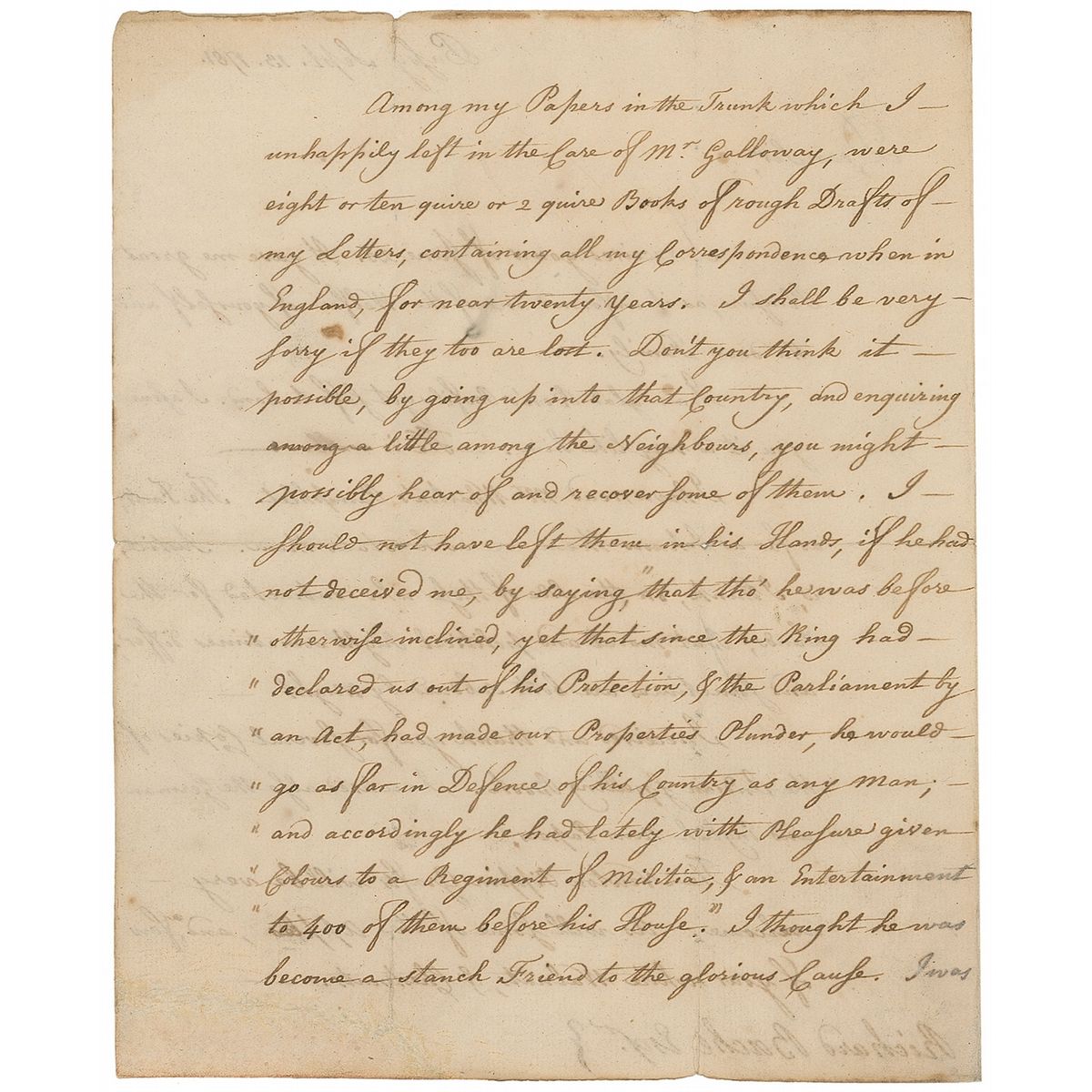 Among my Papers in the Trunk which I unhappily left in the Care of Mr. Galloway, were eight or ten quire or 2 quire Books of rough Drafts of my Letters, containing all my Correspondence when in England, for near twenty Years. I shall be very sorry if they too are lost. Don't you think it possible, by going up into that Country, and enquiring a little among the Neighbours, you might possibly hear of and recover some of them. I should not have left them in his Hands, if he had not deceived me, by saying, ‘that tho' he was before otherwise inclined, yet that since the King had declared us out of his Protection, & the Parliament by an Act, had made our Properties Plunder, he would go as far in Defence of his Country as any Man; and accordingly he had lately with Pleasure given Colours to a Regiment of Militia, & an Entertainment to 400 of them before his House.’ I thought he [had] become a stanch Friend to the glorious Cause. I was mistaken. As he was a Friend of my Son's, to whom in my Will I had left all my Books and Papers, I made him one of my Executors, and put the Trunk of Papers into his Hands imagining them safer in his House (which was out of the Way of any probable March of the Enemies Troops) than in my own. It was very unlucky.