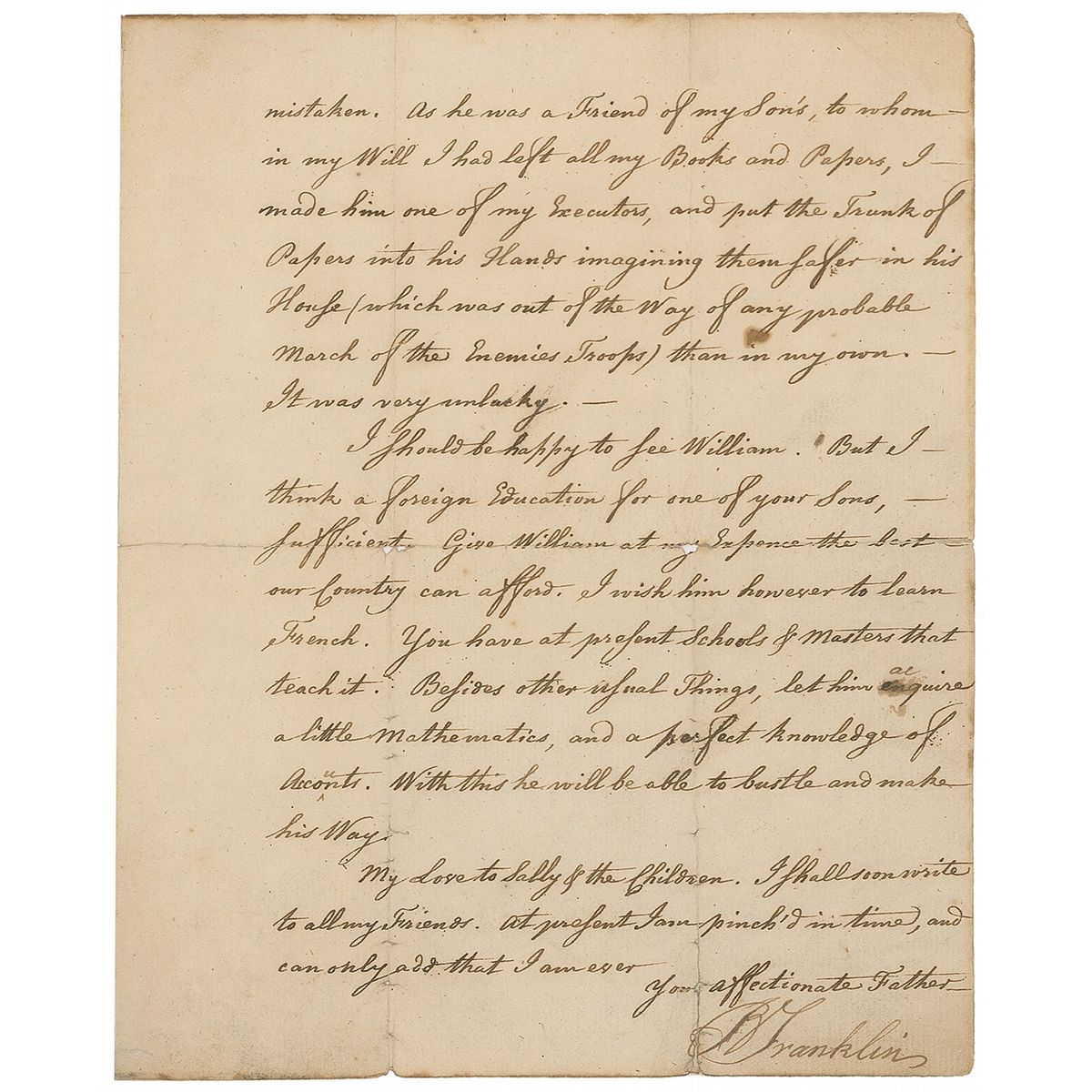 I should be happy to see William. But I think a foreign Education for one of your Sons, sufficient. Give William at my Expence the best our Country can afford. I wish him however to learn French. You have at present Schools & Masters that teach it. Besides other usual Things, let him acquire a little Mathematics, and a perfect knowledge of Accounts. With this he will be able to bustle and make his Way.