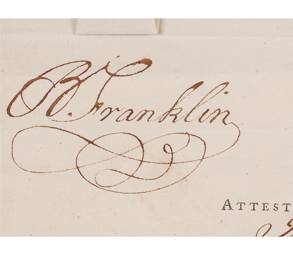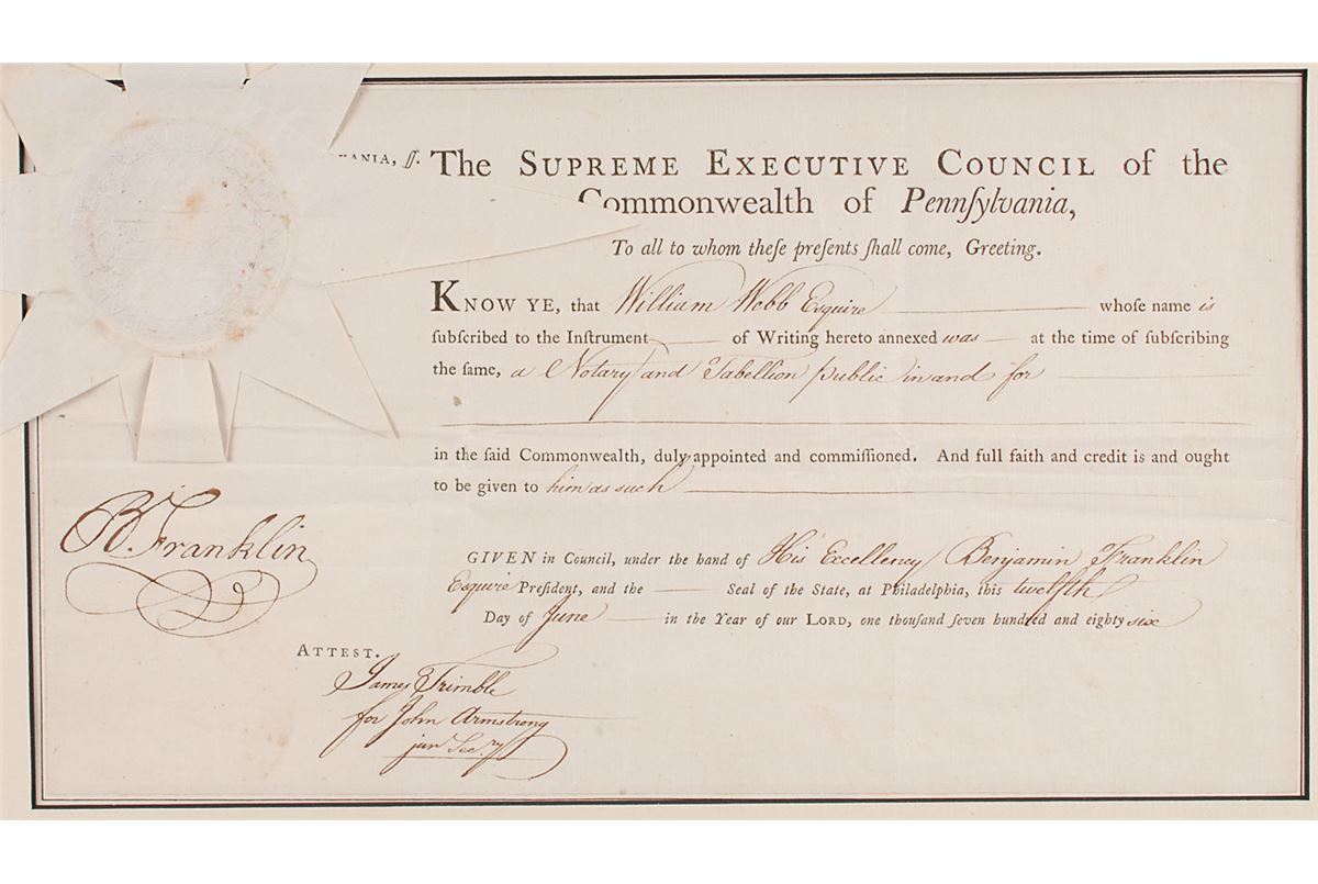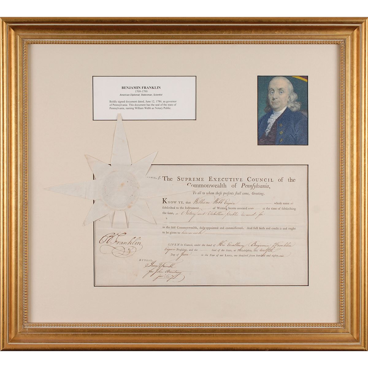 Choice partly-printed DS, signed “B. Franklin,” one page, 12 x 7, June 12, 1786. Commonwealth of Pennsylvania document attesting that William Webb is “a Notary and Tabellion Public in and for the said Commonwealth, duly appointed and commissioned.” Beautifully signed on the left side in bold ink by Franklin and countersigned by James Trimble. The large seal affixed above Franklin’s signature remains fully intact. Attractively matted and framed with a portrait and printed description to an overall size of 21 x 19. In fine condition, with intersecting folds (horizontal folds lightly passing through the signature) and mild soiling; an extremely bright, crisp example of an official Franklin document. Franklin issued this document as president of the Supreme Executive Council of Pennsylvania, a position analogous to the modern position of governor.