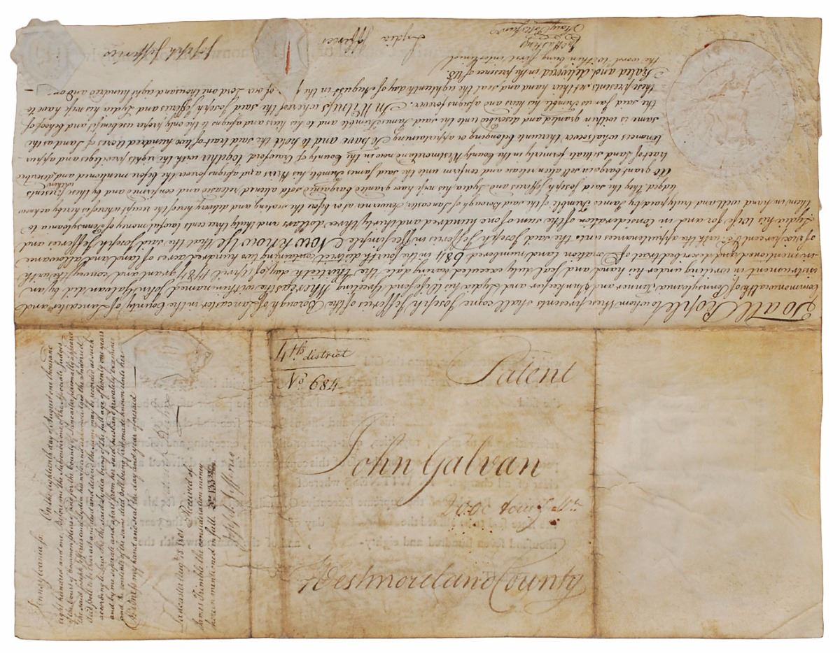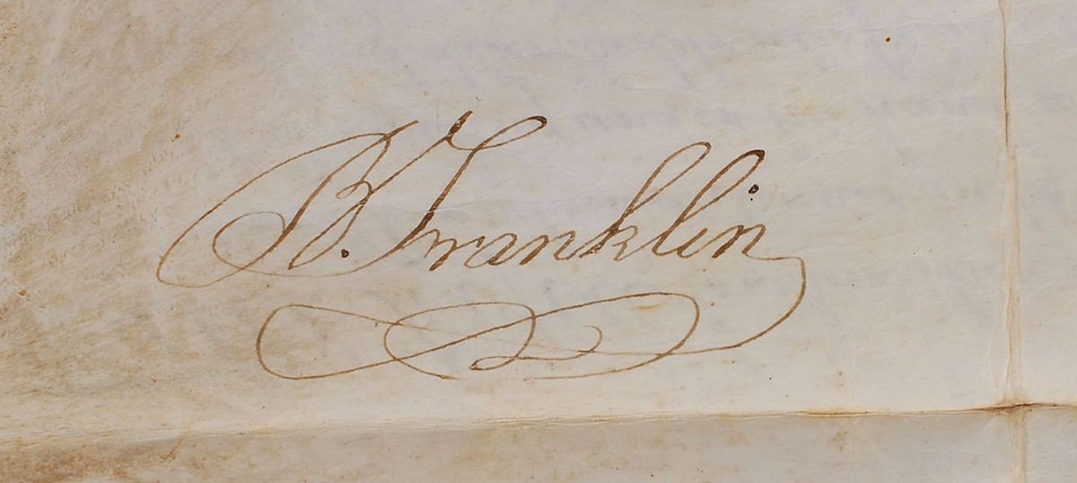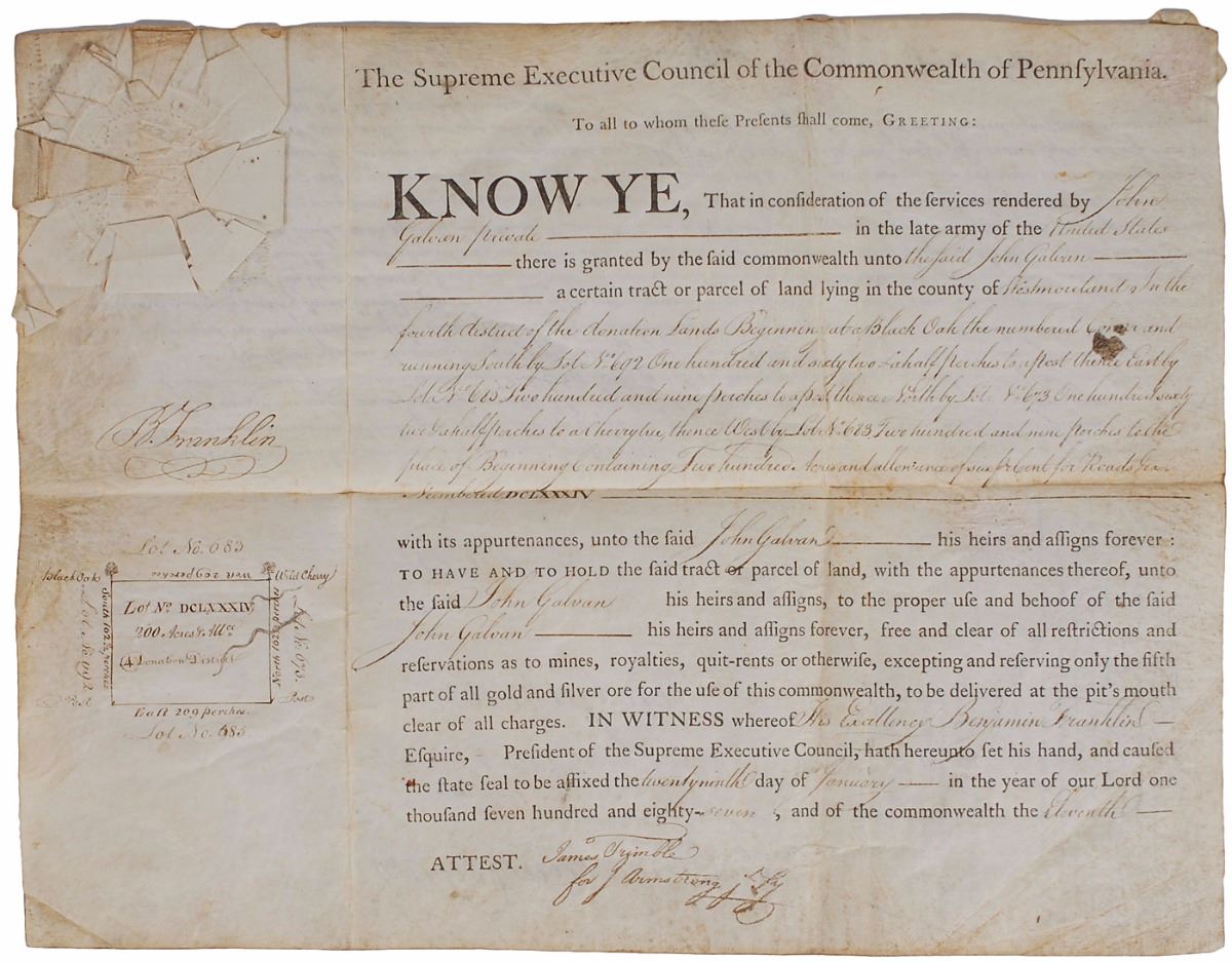 Partly-printed DS, signed “B. Franklin,” one page, 15.25 x 11.75, January 29, 1787. Land grant reads, in part “That in consideration of the services rendered by John Galvan in the late army of the United States there is granted by the said commonwealth unto the said John Galvan a certain tract or parcel of land lying in the county of Westmoreland…containing two hundred acres.” Signed in the left border by Franklin, as president of the Supreme Executive Council, with a 3.5 x 2.5 sketch of the parcel of land, with two posts at two corners and a black oak and wild cherry tree at the other corners. The large eight-point embossed paper seal is toned and folded. In very good condition, with intersecting folds, and scattered foxing and soiling. Franklin served as the sixth and longest-running president of the Supreme Executive Council of the Commonwealth of Pennsylvania, a position he held from October 18, 1875, to November 5, 1788. Franklin would join the Grand Committee of the Constitutional Convention less than four months after this land grant was signed. Enhanced by the uncommon presence of its plot sketch, this is an exceptional signed document from one of America’s founding fathers.
