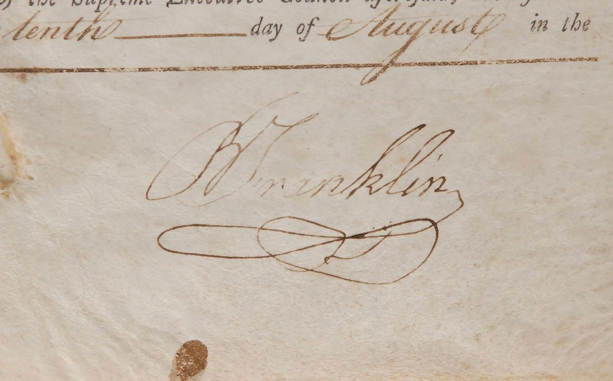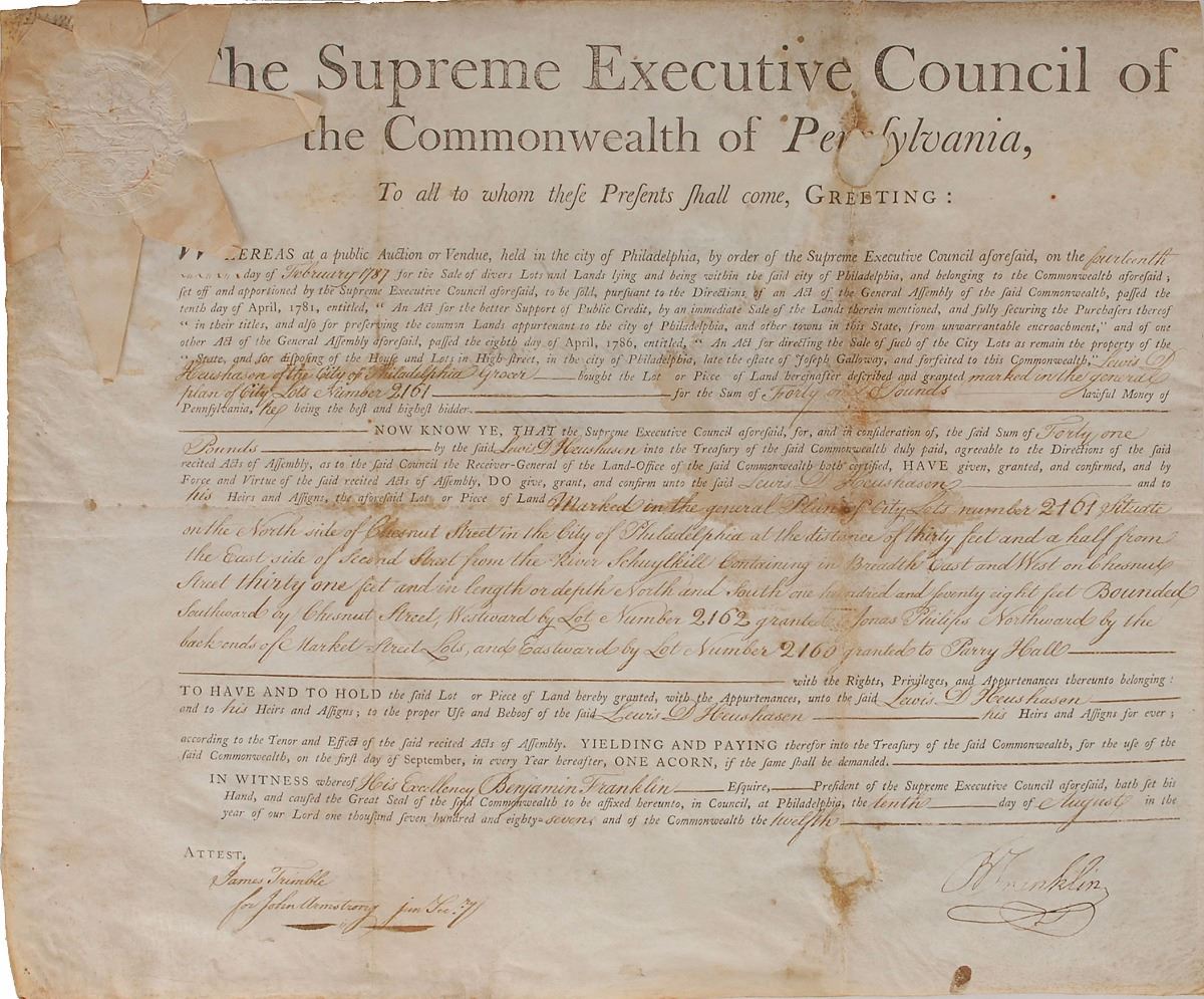 Partly-printed vellum DS, signed “B. Franklin,” one page, 15.75 x 13, August 10, 1787. As president of the Supreme Executive Council of the Commonwealth of Pennsylvania, Franklin issues a land grant to Lewis D. Heushasen “in the city of Philadelphia…for the Sum of Forty one Pounds lawful Money of Pennsylvania.” Neatly signed in the lower right by Franklin and countersigned by James Trimble. In very good condition, with portions of the seal missing, some staining and toning, some small holes and repairs to two larger holes. Franklin’s signature is in a clear area and unaffected by any flaws.
