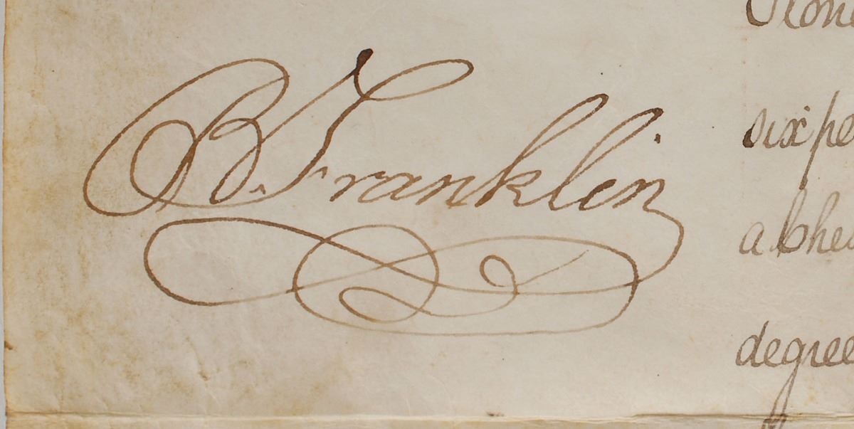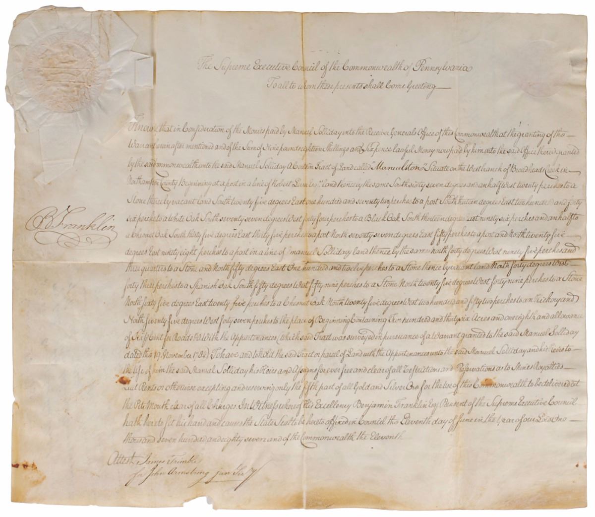 Vellum manuscript DS, signed “B. Franklin,” one page, 15.75 x 13.5, June 11, 1787. Land grant issued by the Supreme Executive Council of the Commonwealth of Pennsylvania in which Manuel Solliday receives “a Certain Tract of Land called ‘Manuelston’ Situate on the West bank of Brodheads Creek in Northampton County.” Crisply signed on the left side by Franklin as president of the Supreme Executive Council, and countersigned at the conclusion by James Trimble. The white paper seal affixed to the upper left remains partly intact, with outward points torn and absent. In very good condition, with intersecting folds, scattered light staining and soiling, and a small area of paper loss to lower edge. Franklin’s large signature is a wonderful example that remains bright and bold.