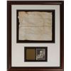 Vellum manuscript DS, signed “B. Franklin,” one page, 15 x 12.5, March 14, 1788. As president of the Supreme Executive Council of the Commonwealth of Pennsylvania, Franklin issues a land grant to John Lane for “a Certain Tract of Land called ‘The Rosefield.’” Signed on the left side by Franklin below the affixed seal. Impressively mounted, matted, and framed with a plaque and portrait to an overall size of 26 x 33. In very good condition, with intersecting folds and moderate overall wrinkling, the lower half of the “B” in Franklin’s signature missing due to edge paper loss (there are a few other less significant areas of paper loss to the document as well), and several points of the seal missing. Oversized.