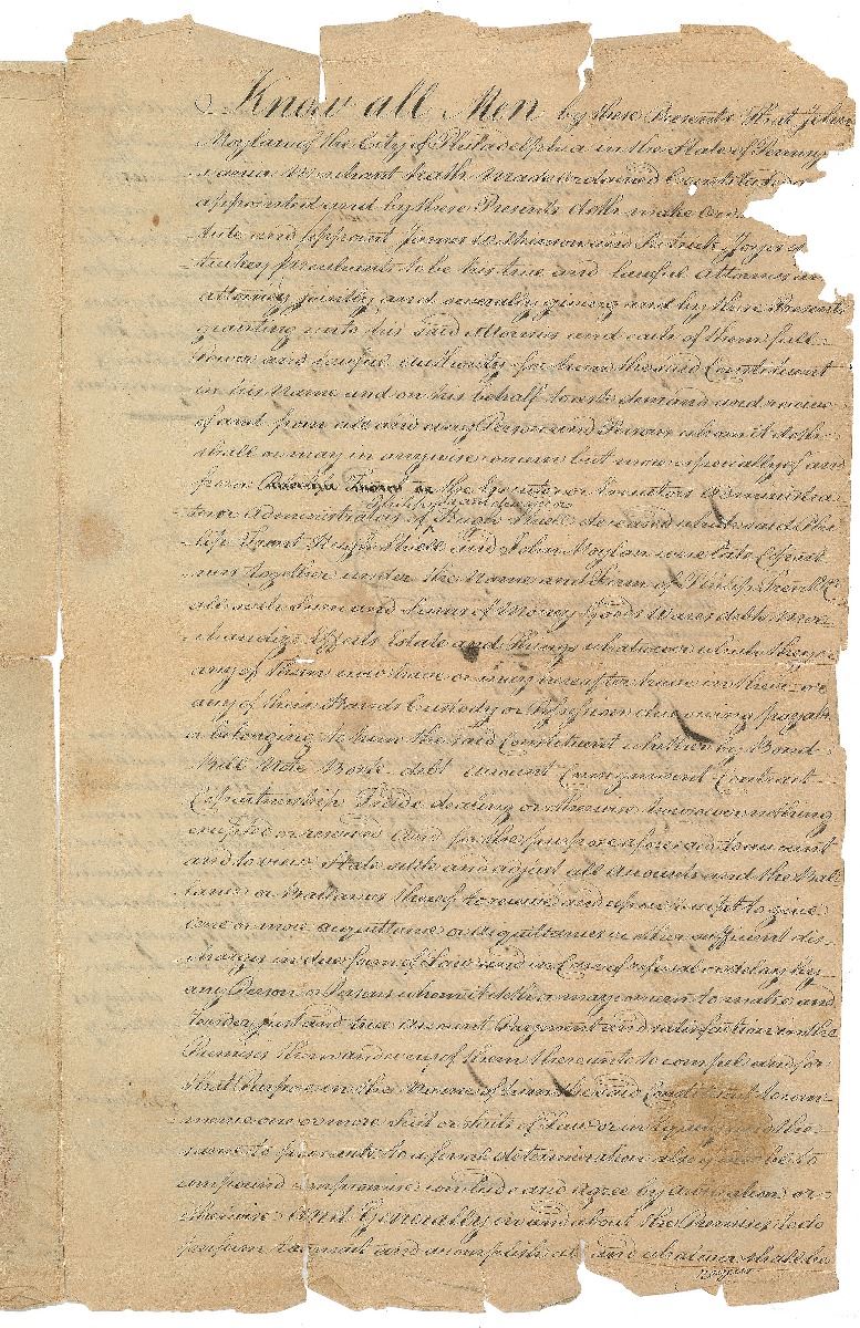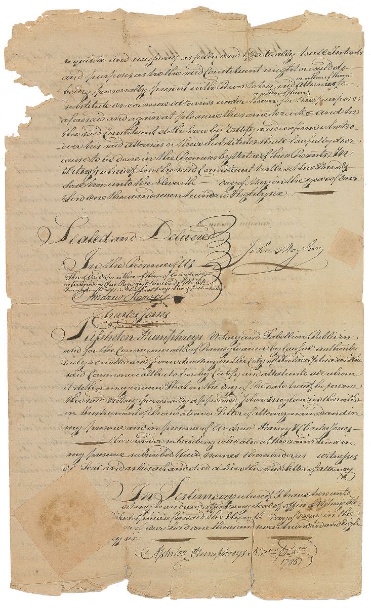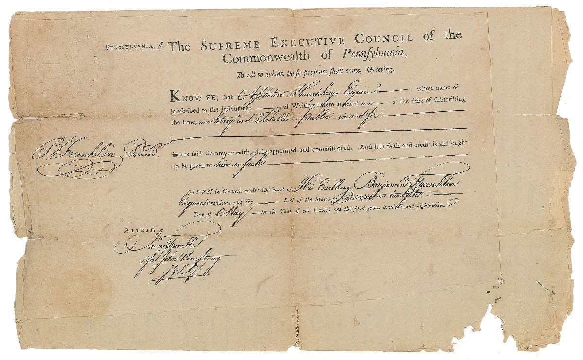 Partly-printed DS, signed “B. Franklin Presid.,” one page, 14.75 x 9, May 12, 1786. As president of the Supreme Executive Council of Pennsylvania, Franklin certifies the status of Assheton Humphreys as “a Notary and Tabellion Public in and for the said Commonwealth, duly appointed and commissioned.” Boldly signed below the blindstamped seal by Franklin and countersigned at the conclusion by James Trimble. A two-page power of attorney document certified by Humphreys is affixed. In very good condition, with a trimmed lower edge and scattered small tears and areas of paper loss. Franklin issued this document as president of the Supreme Executive Council of Pennsylvania, a position analogous to the modern position of governor. Franklin’s signature is a superb, crisp example.