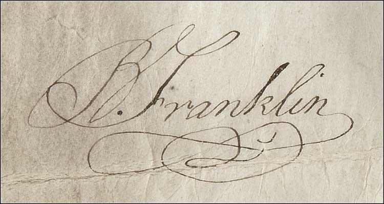 It is worth mentioning that three months after endorsing this land grant in his office at Independence Hall, Franklin attended the first meeting of the Constitutional Convention, which was held in another part of the building. On September 17, 1787, Franklin signed the US Constitution, gracing that landmark document with a similarly familiar signature. Pre-certified John Reznikoff/PSA/DNA and RRAuction COA.