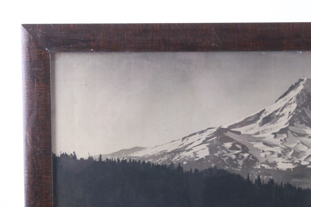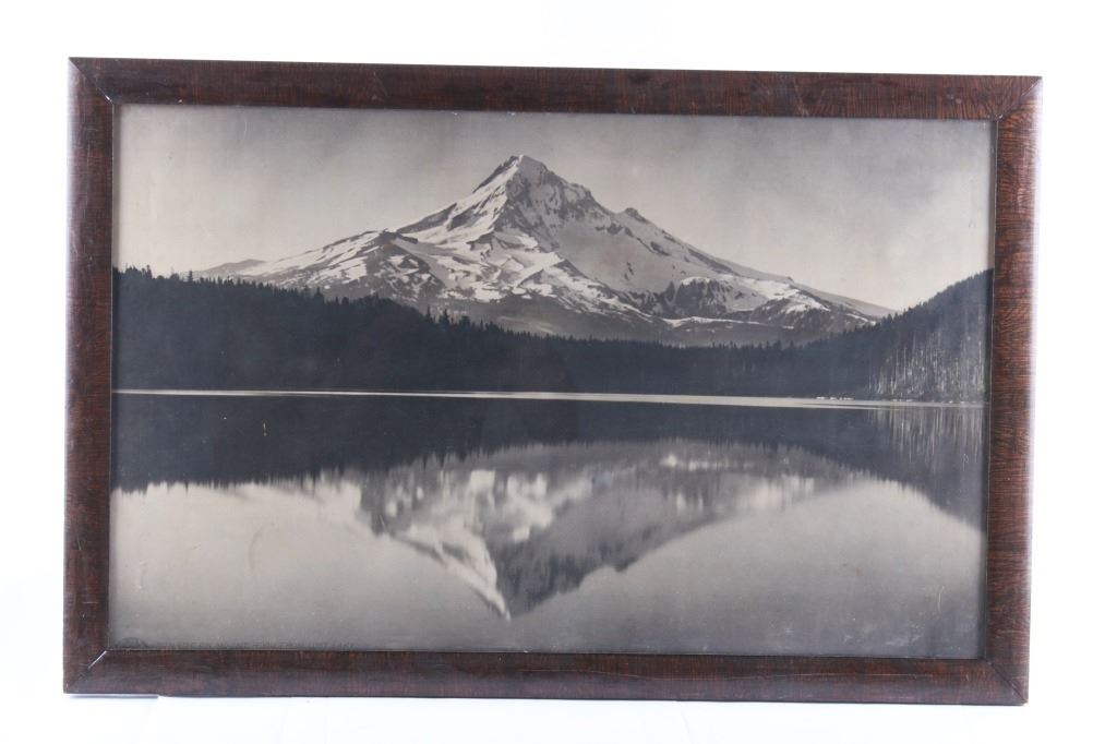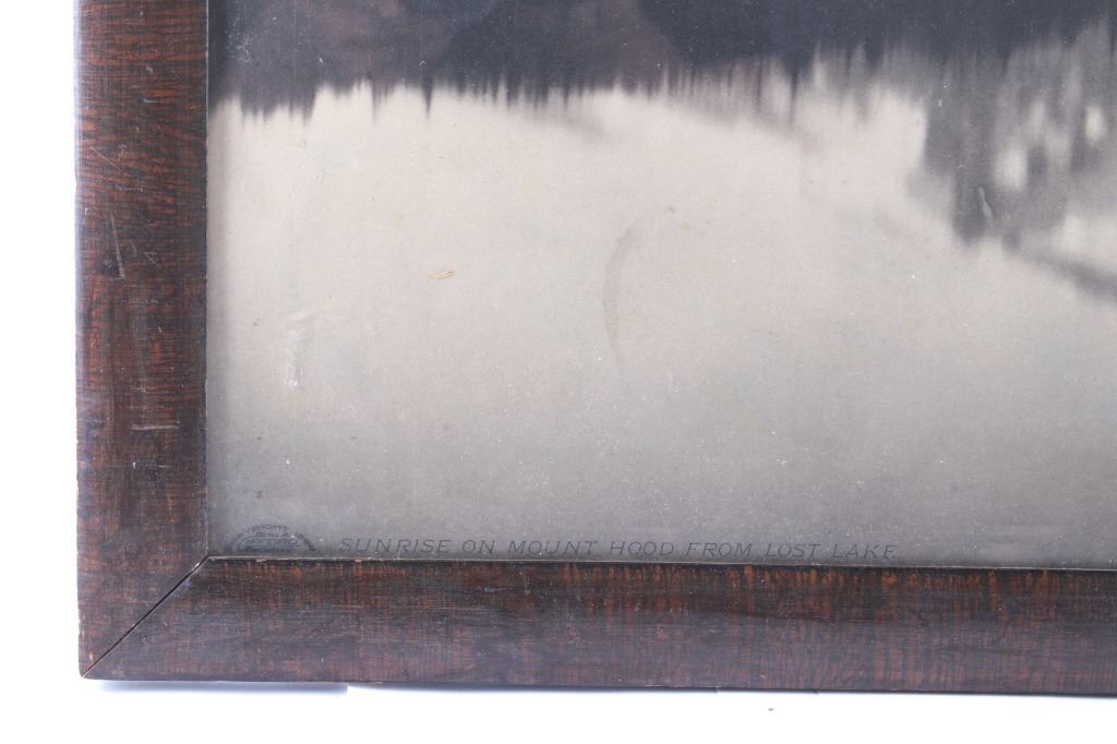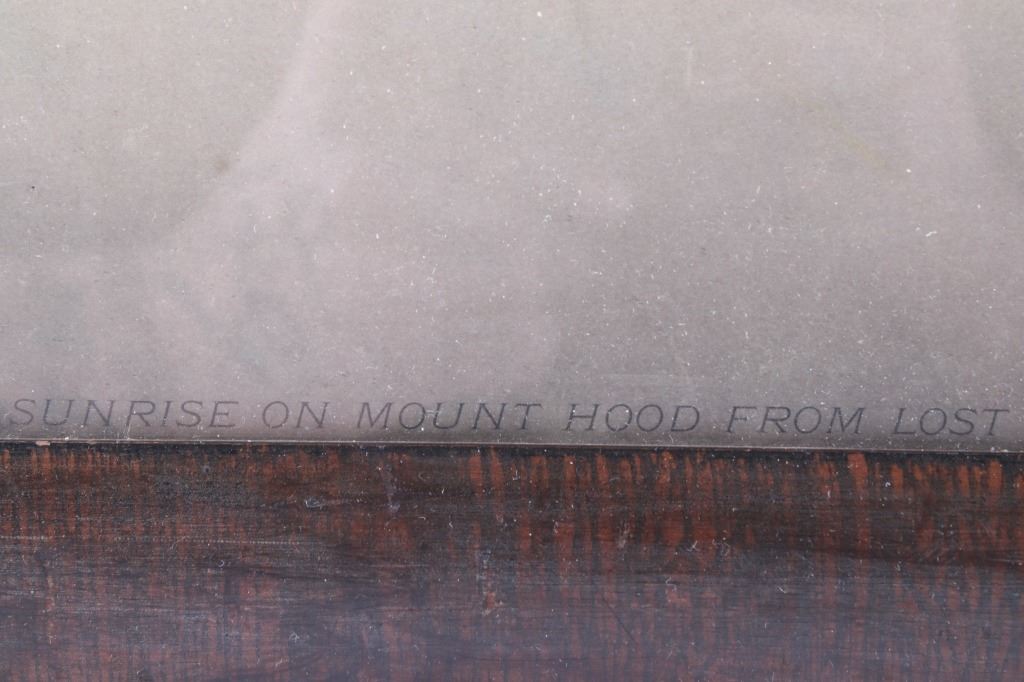 For your consideration in this lot is a 1899 original photograph of "Sunrise On Mount Hood From Lost Lake" by Benjamin Gifford. Benjamin Gifford (1859-1936) is considered to be one of Oregon’s most influential photographers. After completing an apprenticeship at a photo gallery in Kansas, Gifford moved to Portland in 1890 to open his own photography studio that stayed in the family until 1955. This image was taken in 1899 and is considered to be his most famous photograph and one of the earliest and most iconic views of Mt. Hood. Gifford claimed he was offered $1000 (in the early 1900’s!) for the glass plate negative. The whereabouts of the negative is unknown and it is presumed lost or irreversibly damaged. This photograph is copyrighted with Gifford’s mark in the lower left corner that reads "Copyright 1899 Benj .A. Glifford The Dells Or." and titled, "Sunrise On Mount Hood From Lost Lake". It is in an original tiger wood frame. Overall this is a phenomenal example of one of Oregon’s most iconic photographic images by the Grandfather of Oregon Photography. This sold at " Aurora Mills: Antiques, Vintage, Salvage" for over $6000. The photograph and frame shows age and wear to be expected with it's over 120 year age. The frame measures 30 1/2" x 20"