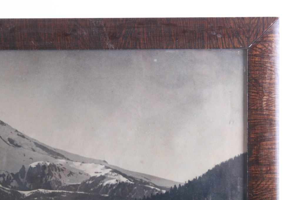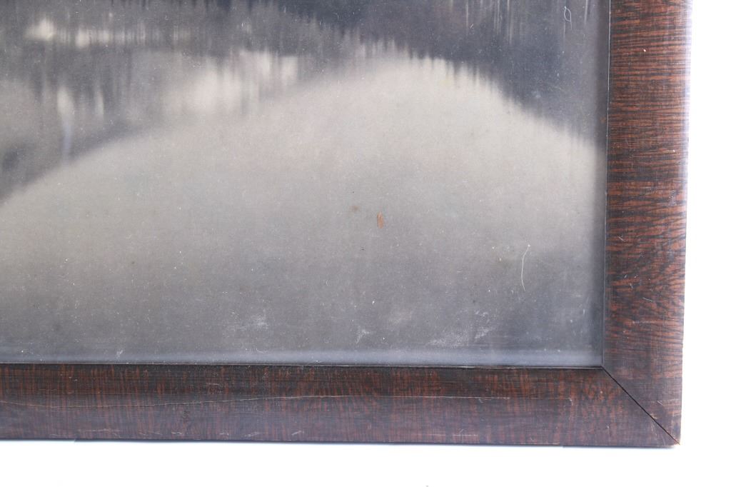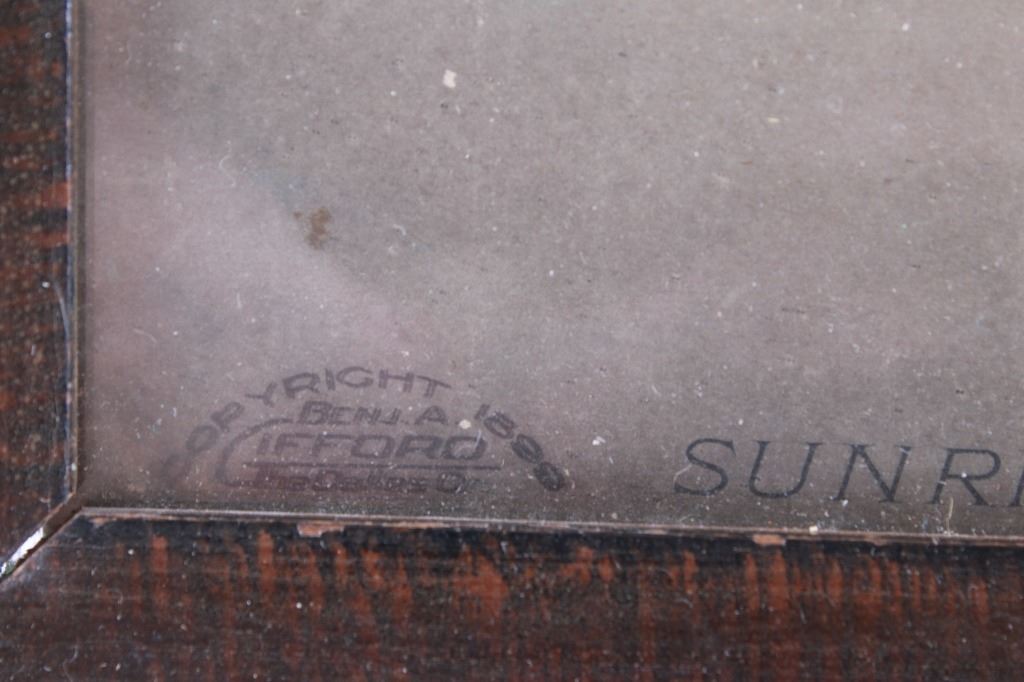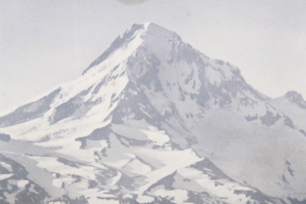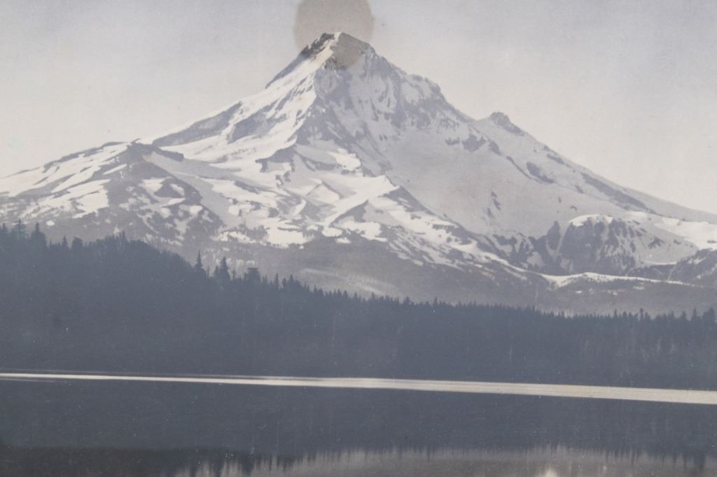 For your consideration in this lot is a 1899 original photograph of "Sunrise On Mount Hood From Lost Lake" by Benjamin Gifford. Benjamin Gifford (1859-1936) is considered to be one of Oregon’s most influential photographers. After completing an apprenticeship at a photo gallery in Kansas, Gifford moved to Portland in 1890 to open his own photography studio that stayed in the family until 1955. This image was taken in 1899 and is considered to be his most famous photograph and one of the earliest and most iconic views of Mt. Hood. Gifford claimed he was offered $1000 (in the early 1900’s!) for the glass plate negative. The whereabouts of the negative is unknown and it is presumed lost or irreversibly damaged. This photograph is copyrighted with Gifford’s mark in the lower left corner that reads "Copyright 1899 Benj .A. Glifford The Dells Or." and titled, "Sunrise On Mount Hood From Lost Lake". It is in an original tiger wood frame. Overall this is a phenomenal example of one of Oregon’s most iconic photographic images by the Grandfather of Oregon Photography. This sold at " Aurora Mills: Antiques, Vintage, Salvage" for over $6000. The photograph and frame shows age and wear to be expected with it's over 120 year age. The frame measures 30 1/2" x 20"