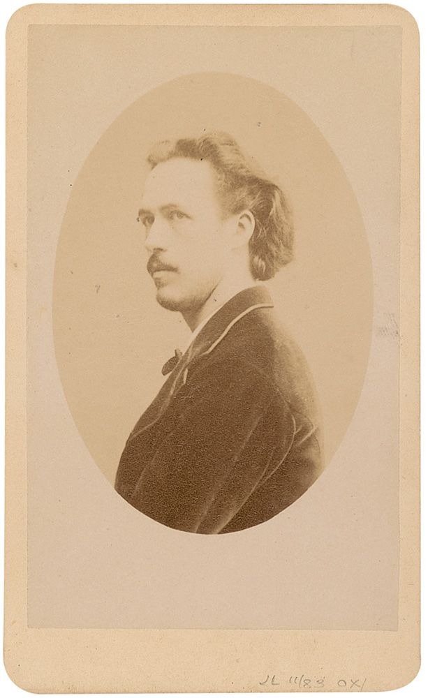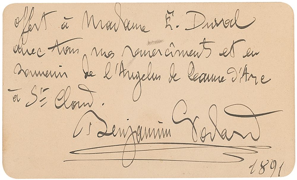French violinist and Romantic composer (1849–1895). Original 2.5 x 4 carte-de-visite photo of Godard, signed and inscribed on the reverse in black ink (translated), “Offered to Madame E. Dumed with all my thanks and in remembrance of the Angelus of Joan of Arc at St. Cloud, Benjamin Godard 1891.” In fine condition.
