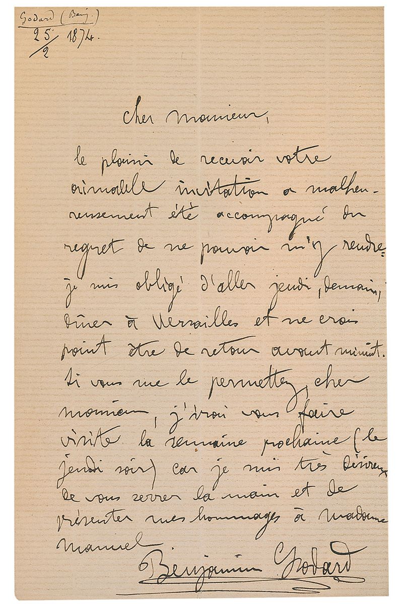 French violinist and Romantic composer (1849–1895). ALS in French, one page, 5.25 x 8.25, February 25, 1874. Letter to a gentleman, declining an invitation. In part (translated): “I am obliged to go on Thursday, tomorrow, and dine in Versailles, and I do not believe I shall be back before midnight.” In fine condition, with intersecting folds (the vertical fold passing through a single letter of the signature), and light overall toning.