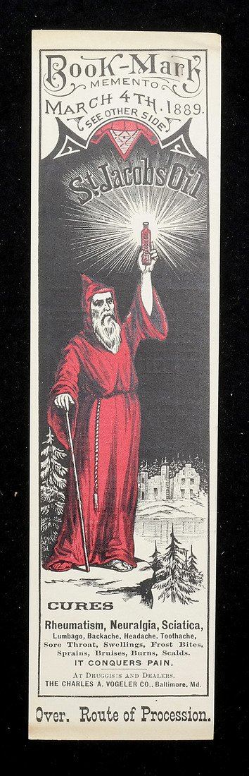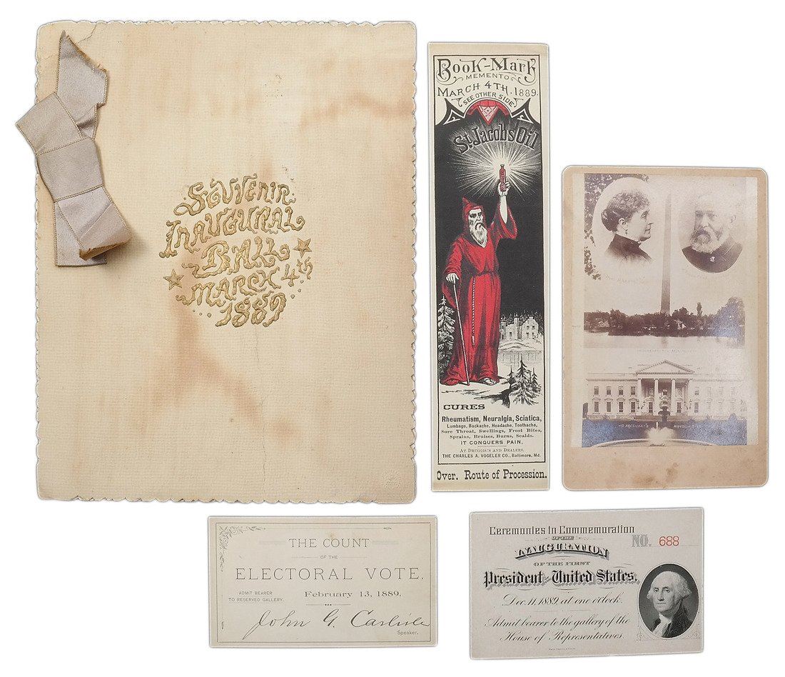 Comprises: 1.) Small 4to booklet with cover gilt-embossed "Souvenir / Inaugural Ball / March 4th / 1889." Retains original wrappers bound with satin ribbon and back cover bearing gilt-embossed federal eagle with a color printed U.S. flag in its talons. Interior contains tissue guards and three etchings: an allegorical scene with figures representing the United States with Washington D.C. in background, portrait of President Harrison, and a portrait of Vice President Morton. Front wrapper blind-stamped at bottom right "Bailey, Banks, & Biddle Makers / Philada" around a rearing unicorn. 2.) Printed 32mo card stock inauguration ticket, No. 688, "Dec. 11 1889 at one o'clock. Admit bearer to the gallery of the House of Representatives." Features an engraved portrait of George Washington at right side. 3.) Doubled-sided advertising slip. Recto imprinted "Route of Procession / Inauguration of..." above jugate portraits of Harrison and Morton and date "March 4th, 1889." Below is a map of Washington D.C. and text instructions. Verso bears a red and black printed pictorial advertisement for "St. Jacobs Oil" espousing "Cures Rheumatism, Neuralgia...Lumbago...Toothaches...Frost Bites...Scalds. It Conquers Pain. At Druggists...The Charles A. Voqeler Co., Baltimore, Md." 4.) Printed oblong 32mo card stock signed "John G. Carlisle," as Speaker of the House. Imprinted "The Count / of the / Electoral Vote / Admit bearer to reserved gallery / February 13, 1889." 5.) Albumen cabinet card with composite images of President Harrison and the First Lady flanking the Washington Monument with the White House below.