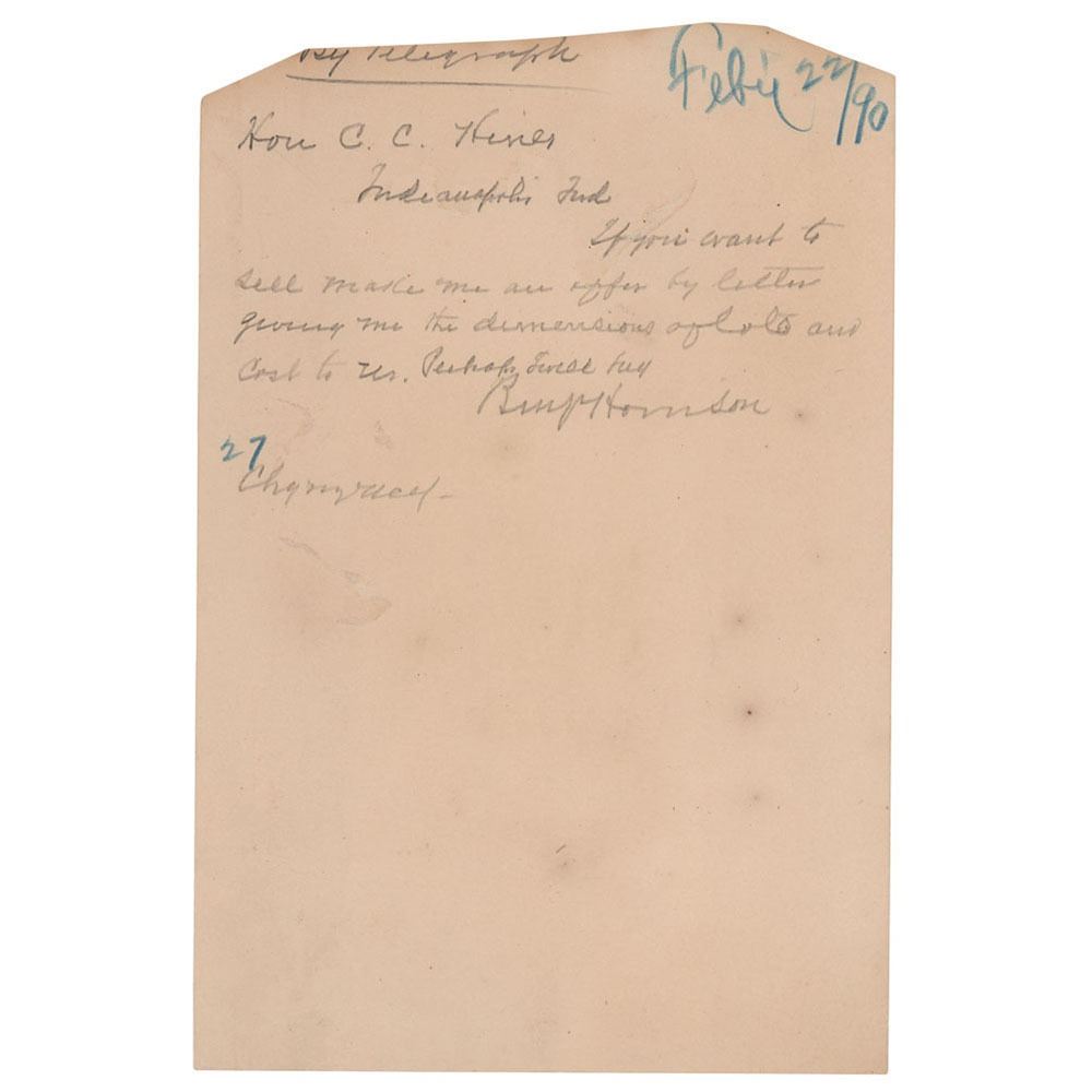 ALS as president, signed “Benj. Harrison,†one page, 5.75 x 8.75, annotated February 22, 1890. Handwritten draft of a telegram to the Hon. C. C. Hines in Indianapolis, marked "By Telegraph." In full: "If you want to sell make me an offer by letter giving me the dimensions of lots and cost to us. Perhaps I will buy." In fine condition, with a trimmed top edge and scattered small stains.