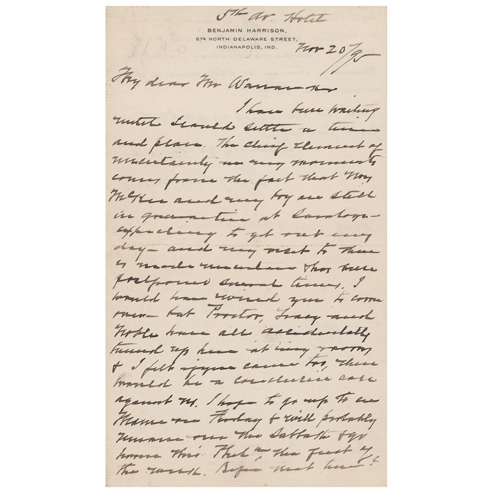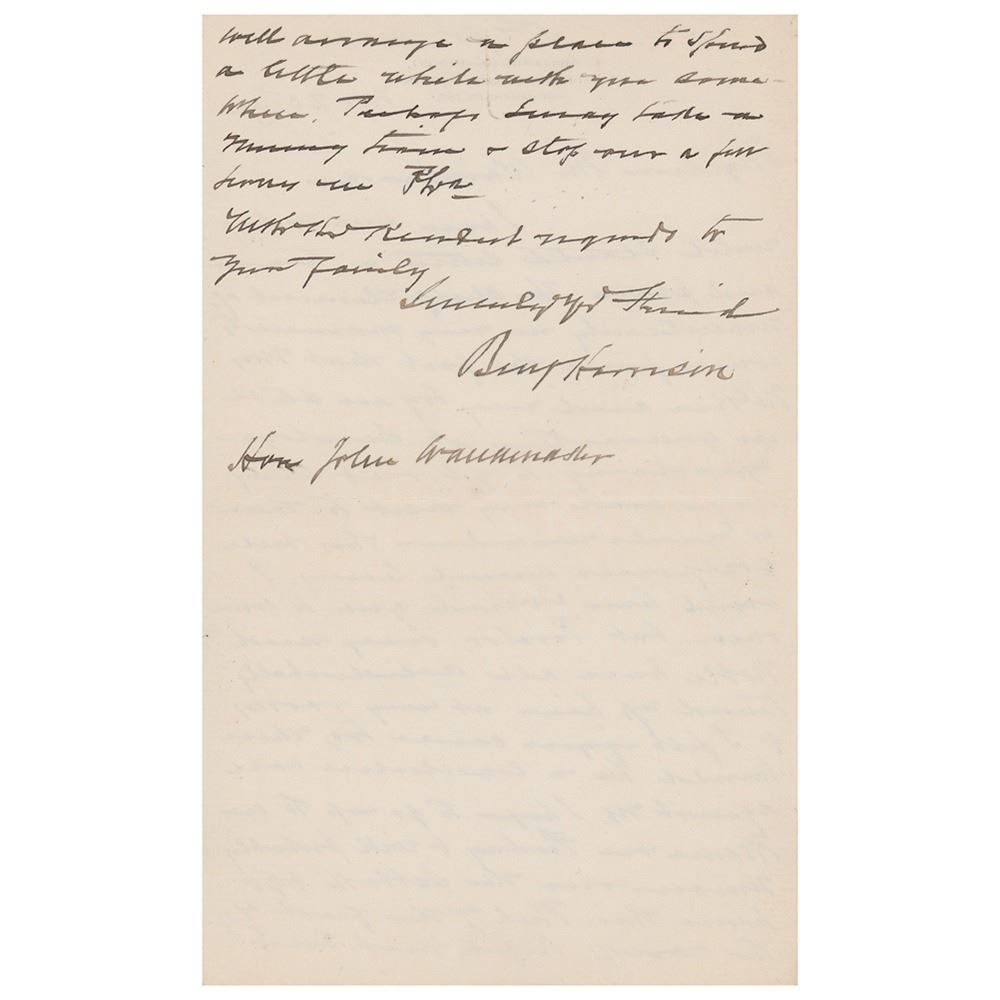 ALS signed “Benj. Harrison,†one page both sides, 4.75 x 8, personal letterhead, November 20, 1895. Handwritten letter to the Hon. John Wanamaker, who had served as postmaster general in Harrison's administration. In part: "I have been waiting until I could settle a time and place. The chief element of uncertainty in my movements comes from the fact that Mrs. McKee and my boy are still in quarantine…expecting to get out any day…I would have wired you to come over—but Proctor, Tracy and Noble have all accidentally turned up here at my rooms." In fine condition.