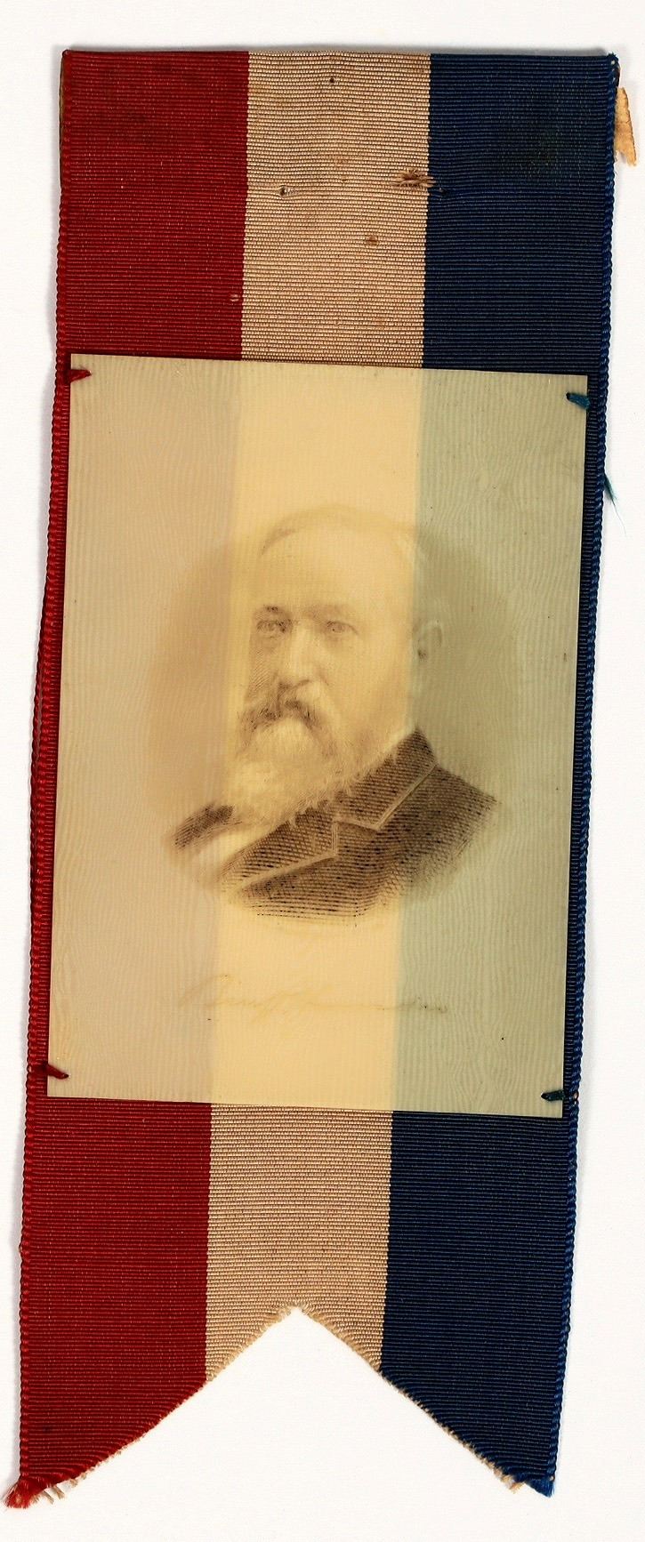 Benjamin Harrison Campaign Ribbon., 1898 Red-White-Blue ribbon w/photo of Harrison. In protective cover. Very good condition.