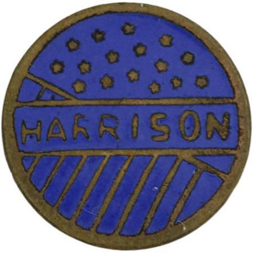 <B>Benjamin Harrison Campaign Stud.</B></I> This campaign stud depicts the name Harrison on a blue enamel "stars and stripes" background. It is in great condition with a wonderful patina to it. The color of the enamel is still bright and vivid. Harrison's 1888 slogan was Rejuvenated Republicanism! Measures 20mm across. <BR><BR><b>Shipping:</b> Miscellaneous Collectibles, Smal (<a target="_blank" href="http://www.heritageauctions.com/common/shipping.php">view shipping information</a>)