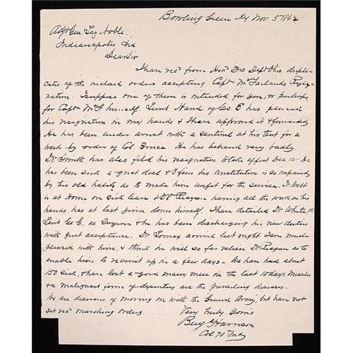 <Our item number 135782><B>Harrison, Benjamin.</B> Autograph letter signed ("Benj Harrison") as Colonel, 70th Indiana, 1p, 9 x 7½ in., Bowling Green, Ky., 5 Nov. 1862. The future President writes to Adjutant General Laz Noble in Indianapolis regarding the resignations of the captain, a lieutenant (who is under arrest), and the doctor ("I fear his constitution is so impaired by his old habits as to make him unfit for the service.") Harrison notes "We have had about 150 sick & have lost a good many men in the last 10 days. Measles & a malignant form of dysentery are the prevailing diseases. We are desirous of moving on with the 'Grand Army' but have not yet received marching orders." Fine; the two lower corners are trimmed, affecting nothing. Boldly penned and signed. <BR>Estimated Value $600 - 800. <BR><BR>Our item number 135782<BR><IMAGES><P ALIGN="CENTER"><IMG SRC="http://www.goldbergcoins.net/liveauction/49jpegs/135782.jpg"> </P></IMAGES>