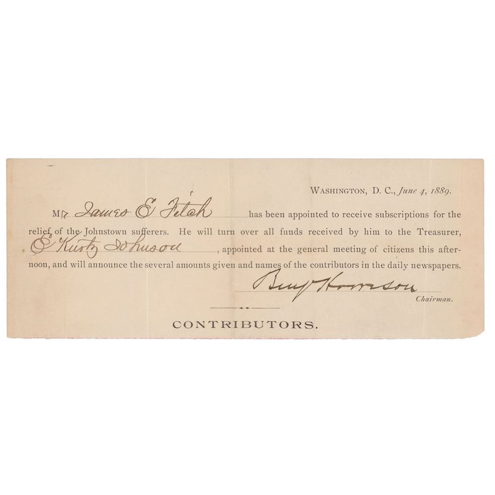 Rare partly-printed DS as president, signed “Benj. Harrison,†one page, 8.5 x 3.25, June 4, 1889. President Harrison appoints James E. Fitch "to receive subscriptions for the relief of the Johnstown sufferers. He will turn over all funds received by him to the Treasurer, E. Kurtz Johnson, appointed at the general meeting of citizens this afternoon, and will announce the several amounts given and names of the contributors in the daily newspapers." Signed neatly at the conclusion by Harrison. In fine condition, with several vertical folds.