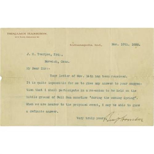 <B>Benjamin Harrison Typed Letter Signed</B></I> "<I>Benj Harrison</B></I>" as President-elect, one page, 8.5" x 5.5". Indianapolis, Indiana, November 16, 1888. To J.H. Tourjee, Esq., Norwich, Conn. In full, "<I>Your letter of Nov. 14th has been received. It is quite impossible for me to give any answer to your suggestion that I shall participate in a re-union to be held on the battle ground of Bull Run sometime 'during the coming Spring'. When we are nearer to the proposed event, I may be able to give a definite answer.</B></I>" In the Civil War, Harrison was Colonel of the 70th Indiana Volunteer Infantry Regiment, later breveted as a Brigadier General. Ten days before writing this letter, former Indiana Senator Benjamin Harrison defeated incumbent President Grover Cleveland in the presidential election. Cleveland had more popular votes, 5.5 million to 5.4 million, but Harrison won in electoral votes, 233-168. Minor wear at folds, partial split in lower fold in blank area, nicked at left edge. Overall, in fine condition.<BR><BR><b>Shipping:</b> Flat Material, Small (<a target="_blank" href="http://www.heritageauctions.com/common/shipping.php">view shipping information</a>)
