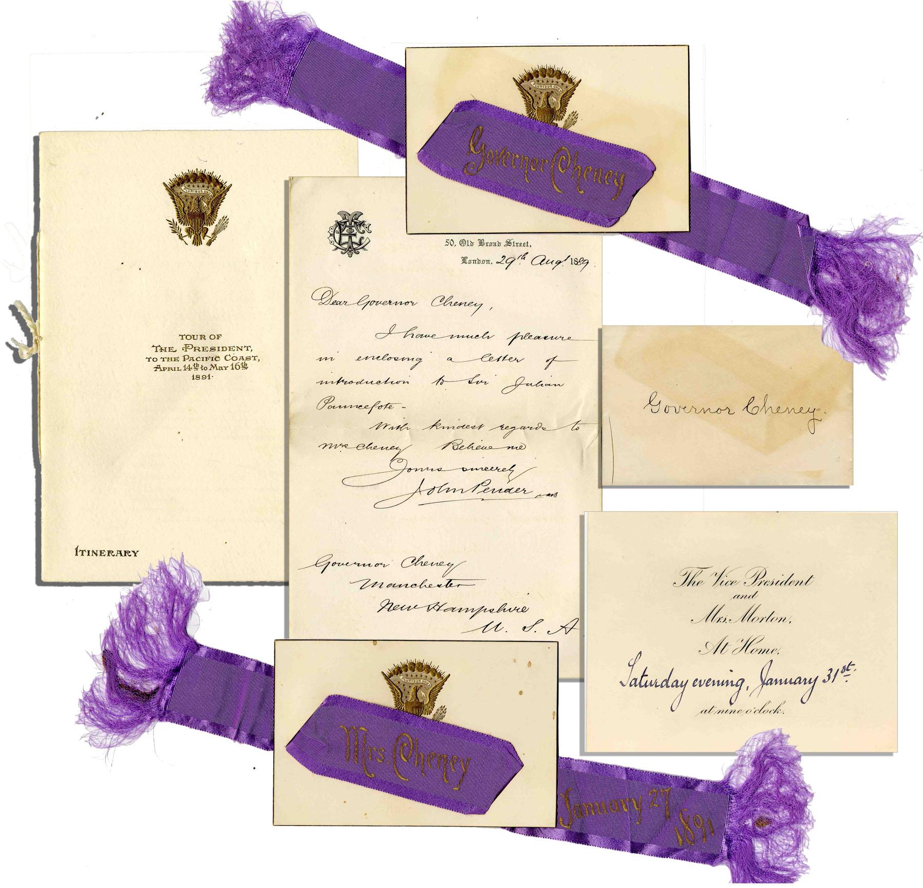 Grouping of items surrounding the Pacific Coast railway tour President Harrison took in April of 1891, including an itinerary listing each stop, an 1890 population census for each city and a 21'' x 13.25'' foldout map of the journey. Also includes an autograph letter signed by British telecommunications pioneer John Pender to Governor Person Colby Cheney of New Hampshire, dated 29 August 1889, and an invitation to Governor Cheney for dinner with Vice President Levi Morton, with original place settings. Near fine.