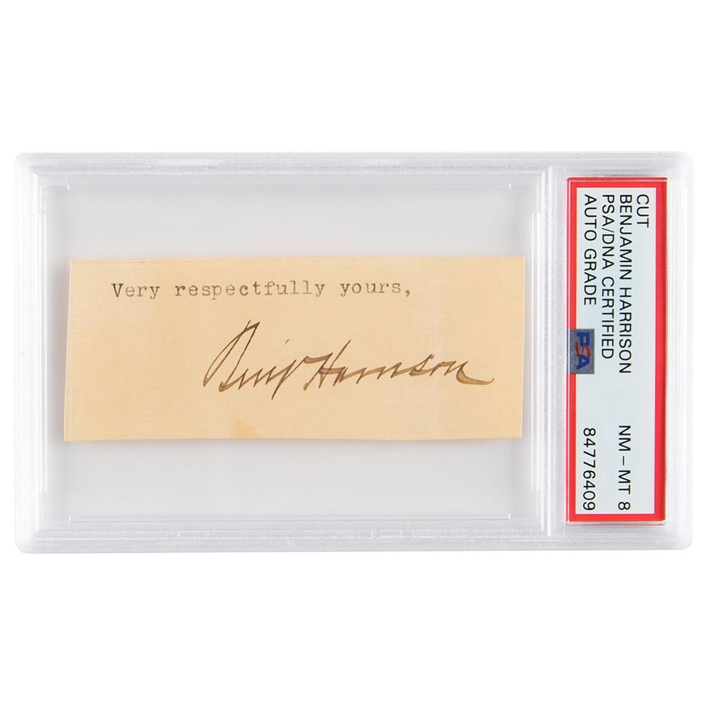 Ink signature of Benjamin Harrison, "Benj. Harrison,& rdquo; on an off-white 3.5 x 1.5 sheet clipped from a typed letter. In fine condition. Encapsulated and graded by PSA/DNA as "NM-MT 8."