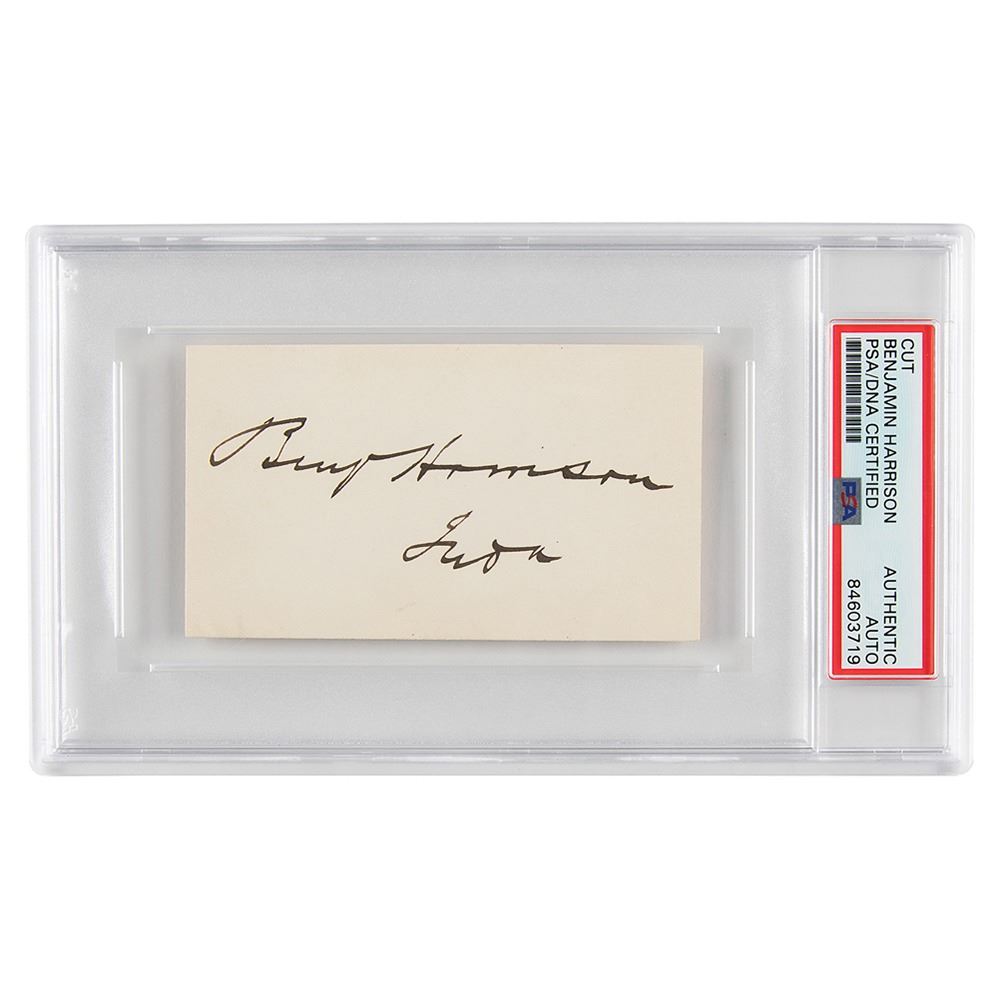 Ink signature, "Benj. Harrison, Ind'a,†on an off-white 4 x 2.25 card. In very fine condition. Encapsulated in a PSA/DNA authentication holder.