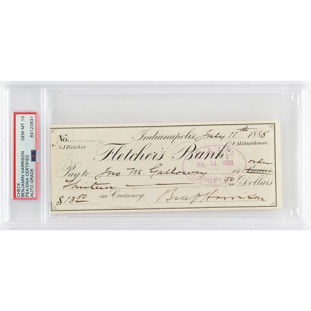 Fletcher's Bank check, 7 x 2.75, filled out and signed by Harrison, "Benj. Harrison," payable to Jonathan M. Galloway for $13.50, July 11, 1888. In fine condition. Encapsulated in a plastic PSA/DNA authentication holder, grading the autograph as "GEM MT 10."