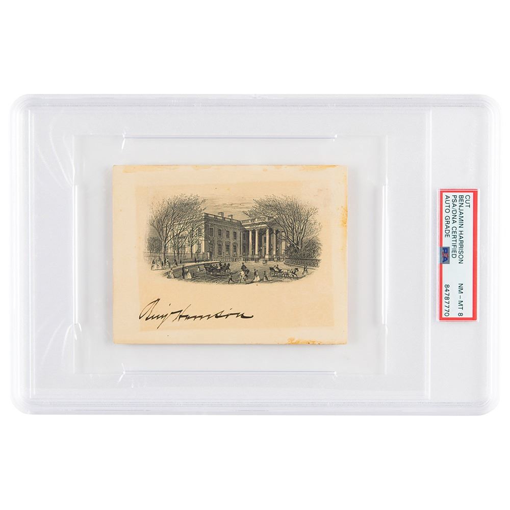 Handsome engraved portrait of the White House, 4.75 x 3.75, signed in the lower border in bold ink, "Benj. Harrison." In very good to fine condition, with toning from prior display, and old adhesive residue on the back. Encapsulated and graded by PSA/DNA as "NM-MT 8."