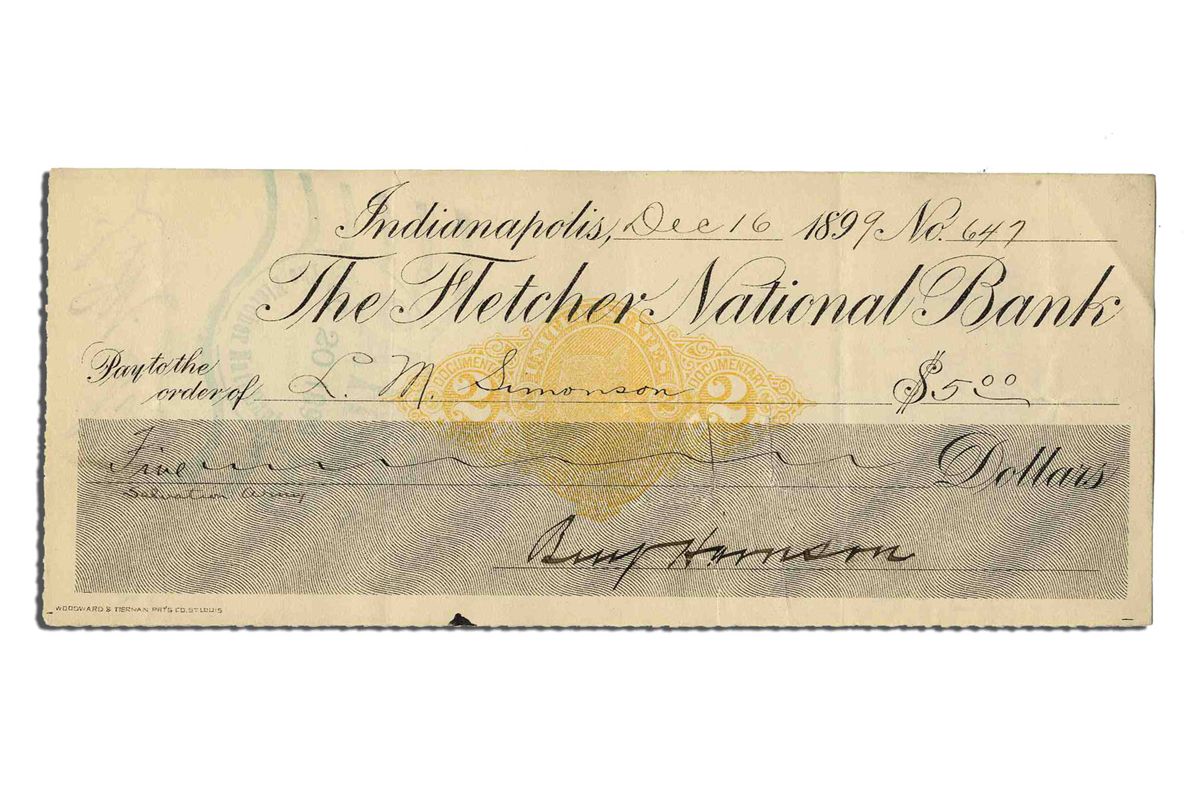 Benjamin Harrison signed check dated 16 December 1899, written entirely in Harrison's hand. Check in the amount of $5.00 is drawn on Fletcher's Bank in Indianapolis. 7.25'' x 2.75'' check has two minor creases affecting signature. Very good condition.