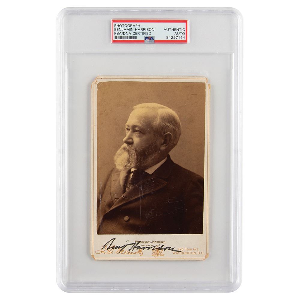 Uncommon 4.25 x 6.5 cabinet photo of President Harrison by J. D. Merritt of Washington, D.C., nicely signed on the mount in ink, "Benj. Harrison." In fine condition, with trivial loss to the corner tips. Harrison is scarce in this format—we have offered only one other signed photograph in the last five years. Encapsulated in a PSA/DNA authentication holder.