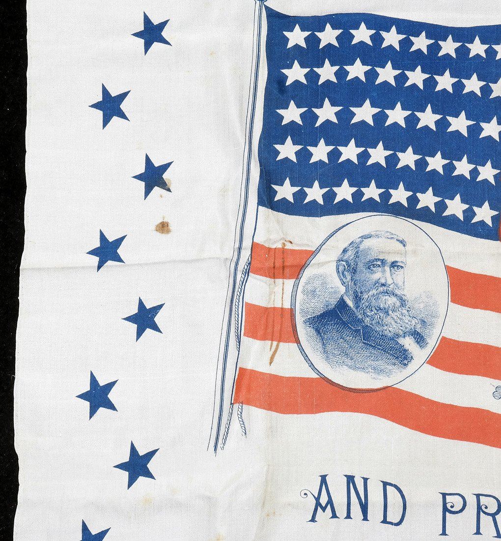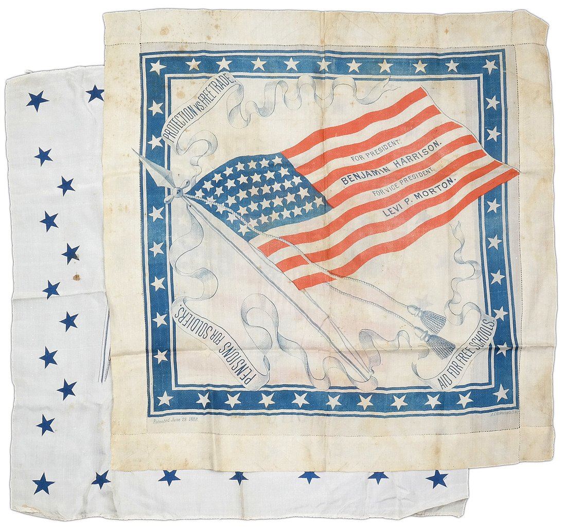 Printed red, white, and blue silk handkerchiefs/bandanas supporting 1888 Republican candidate Benjamin Harrison and running mate Levi P. Morton. 1.) Depicts flag imprinted "For President / Benjamin Harrison / For Vice President / Levi P. Morton". Surrounded by ribbons with text, "Protection vs. Free Trade. / Pensions for Soldiers. / Aid for Free Schools." and surrounded by thick blue starred border. Left margin imprinted "Patented June 28, 1888 / A.S. Rosenthal & Co. N.Y." 2.) Depicts jugate portraits of Harrison and Morton and Civil War service medal on a 39-star flag with text, "The Old Flag / And Protection."