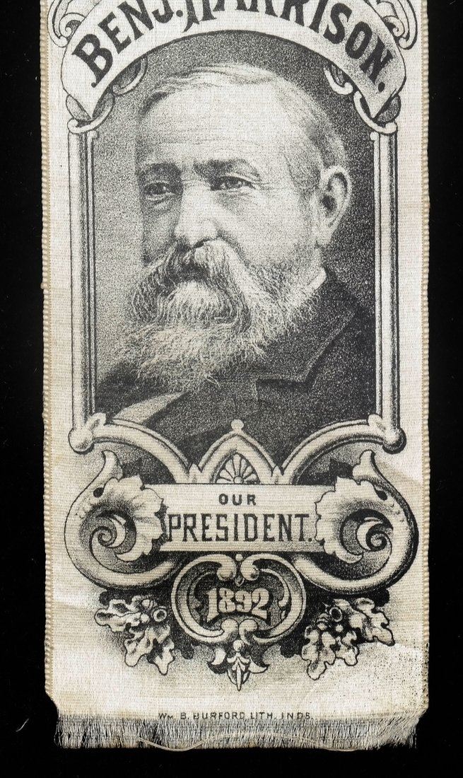 Comprises: 1.) Red, white, and blue vertically striped ribbon with applied celluloid portrait plaque bearing a facsimile signature at bottom. Features bold gilt-stamped text "Protection / Reciprocity / Harrison And Reid. / Victory." Verso bears rubber stamped manufacturer's imprint "J.H. Shaw" / 818 Arch St. Phila. / Badges & Buttons, / Agents Wantd." 2.) Off-white ribbon with black printed portrait contained within an elaborate surround surmounted by a federal eagle with U.S. flag. Bears text "Benj. Harrison. / Our President / 1892." Imprinted at bottom edge "Wm. B. Burford Inds."