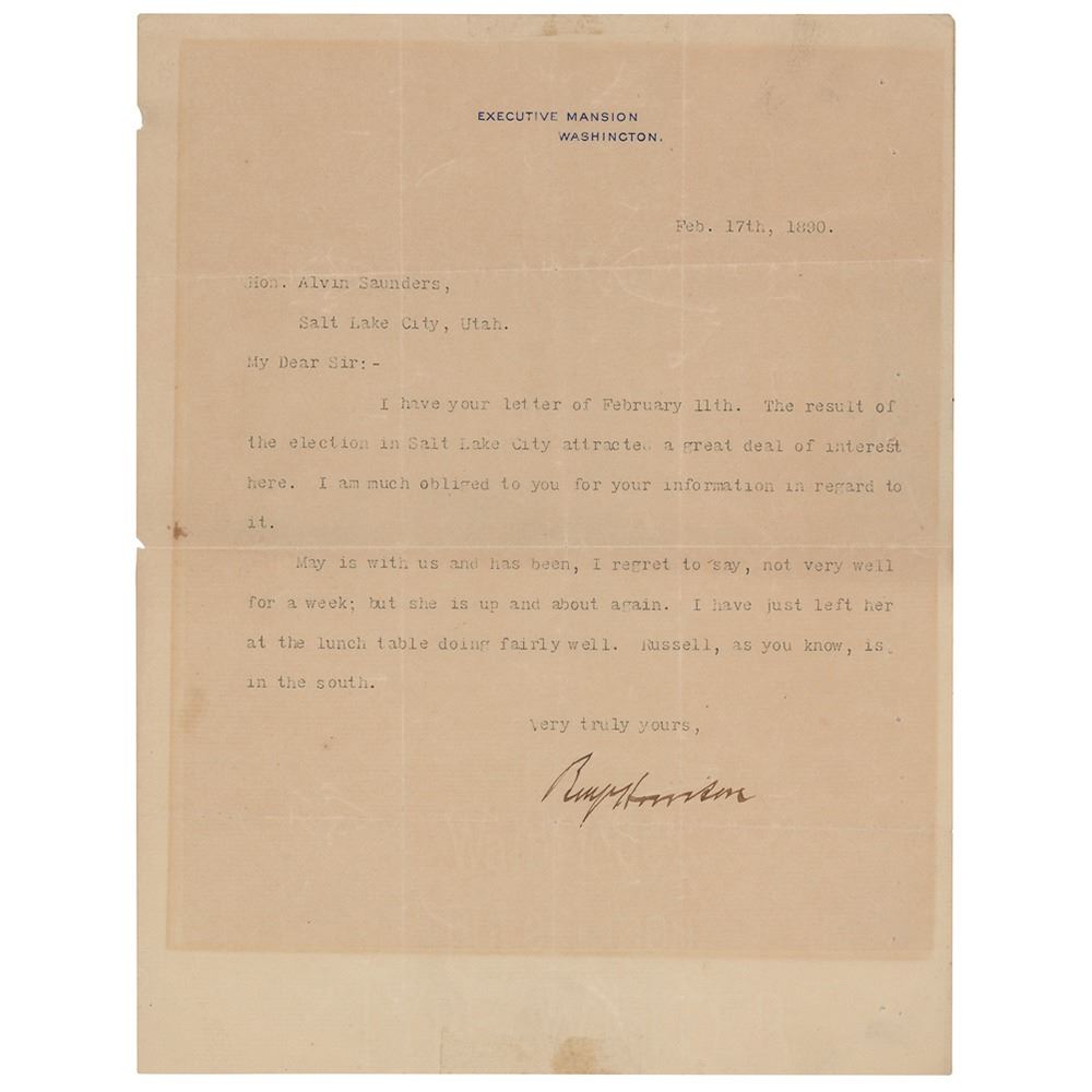 TLS as president signed “Benj. Harrison,†one page, 8 x 10.5, Executive Mansion letterhead, February 17, 1890. Letter to the Hon. Alvin Saunders, in part: "The result of the election in Salt Lake City attracted a great deal of interest here. I am much obliged to you for your information in regard to it. May is with us and has been, I regret to say, not very well for a week; but she is up and about again. I have just left her at the lunch table doing fairly well. Russell, as you know, is in the south." In very good to fine condition, with chips and stains to the edges, multiple intersecting folds, and toning from prior display.
