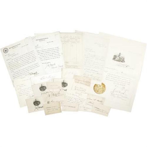 <B>Benjamin Harrison's Presidency.</B></I> A group lot of 32 autographs in various formats by members of Harrison's administration. Includes: <B>John W. Foster</B></I> (ALS and a clipped signature); <B>Levi P. Morton</B></I> (signature on a card adding "<I>Rhinebeck 1888</B></I>"), <B>William H.H. Miller</B></I> (4 signatures), <B>John W. Noble</B></I> (AES and a signature on a card); <B>Redfield Proctor</B></I> (DS and signature on a card); <B>Jeremiah Rusk</B></I> (DS and 3 signatures); <B>J.R. Soley</B></I> (signature); <B>Benjamin F. Tracy</B></I> (3 signatures); <B>John Wanamaker</B></I> (2 TLsS, 3 signed engravings of Independence Hall, one clipped signature); <B>Stephen B. Elkins</B></I> (TLS, LS, and a signature); <B>James G. Blaine</B></I> (signature); <B>Charles Foster</B></I> (2 signatures); and <B>Henry B. Brown</B></I> (signature on a card). Overall condition is good to very good, with many pieces having mounting remnants to verso. <I>From the collection of Henry E. Luhrs.</B></I><BR><BR><b>Shipping:</b> Miscellaneous Collectibles, Smal (<a target="_blank" href="http://www.heritageauctions.com/common/shipping.php">view shipping information</a>)