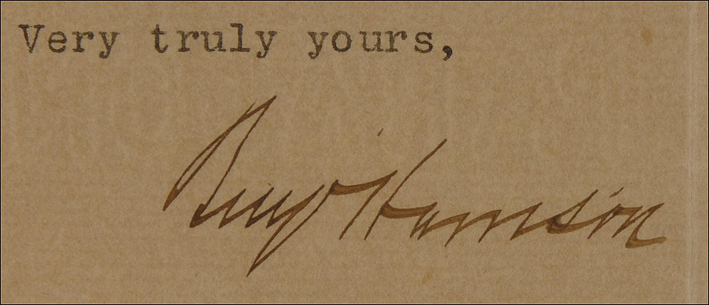 TLS as president signed “Benj. Harrison,” one page, 7.25 x 8, Executive Mansion letterhead, August 2, 1892. The president writes Colonel C. W. Woolley of White Sulpher Springs, West Virginia. In part: “Even in the hurry and rush of these last days of Congress I cannot refrain from taking time to thank you for your letters…Our campaign is at present only in a state of inquiry and observation I suppose; and definitely outlines have not yet been agreed upon. I thank you very sincerely for your personal interest as well as for your suggestions.” Double-matted with an oval cabinet photograph and framed to an overall size of 19 x 14. In very good condition, with few creases, intersecting folds, and moderate uniform overall toning.
