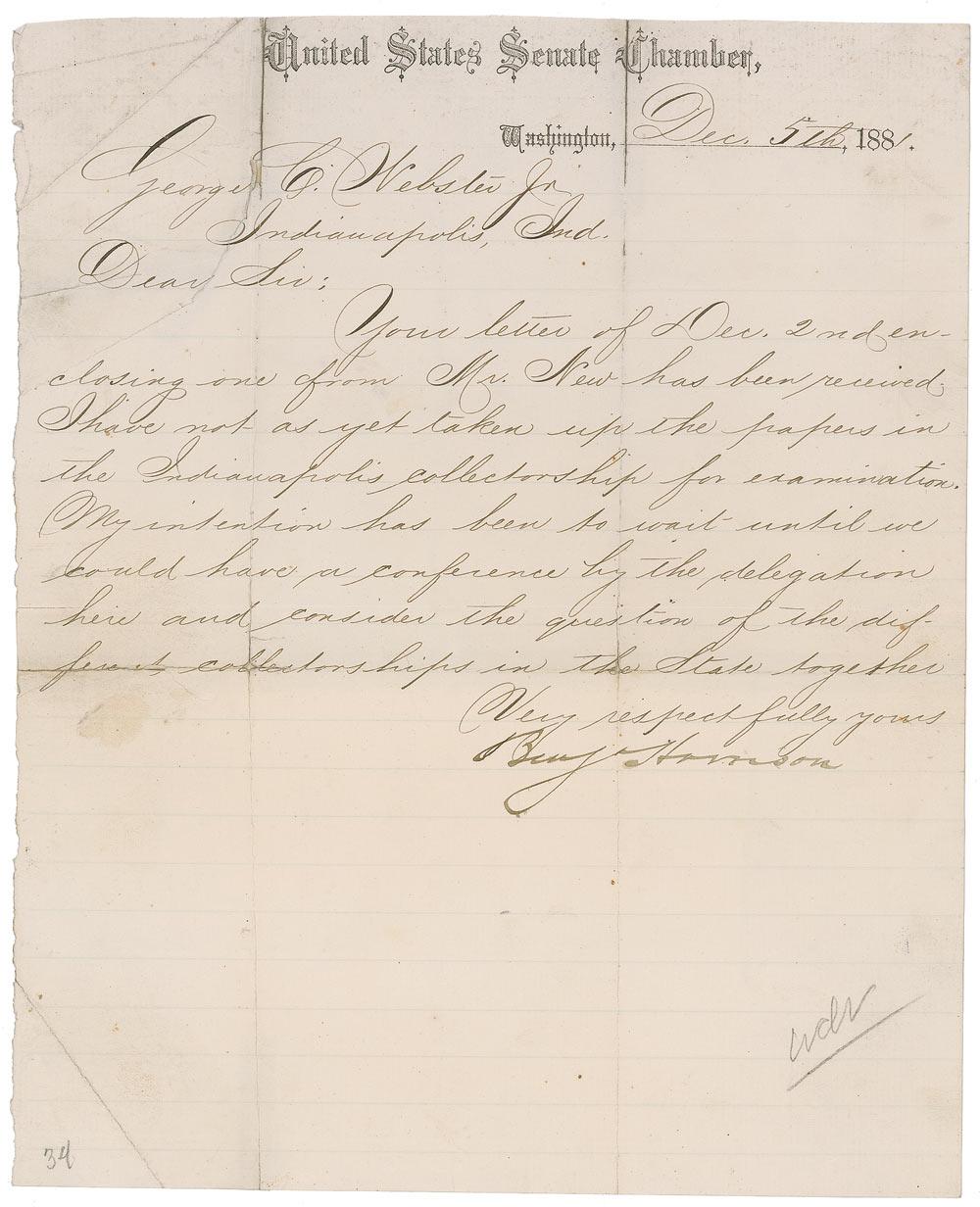 LS signed “Benj. Harrison,” one page, lightly-lined, 7.5 x 9.5, United States Senate Chamber letterhead, December 5, 1881. Letter to George Webster, Jr. In full: “Your letter of Dec. 2nd enclosing one from Mr. New has been received. I have not as yet taken up the papers in the Indianapolis collectorship for examination. My intention has been to wait until we could have a conference by the delegation here and consider the question of the different collectorships in the State together.” In very good condition, with intersecting folds, one through a single letter of signature, lightly trimmed top edge, scattered toning and soiling, and several creases.
