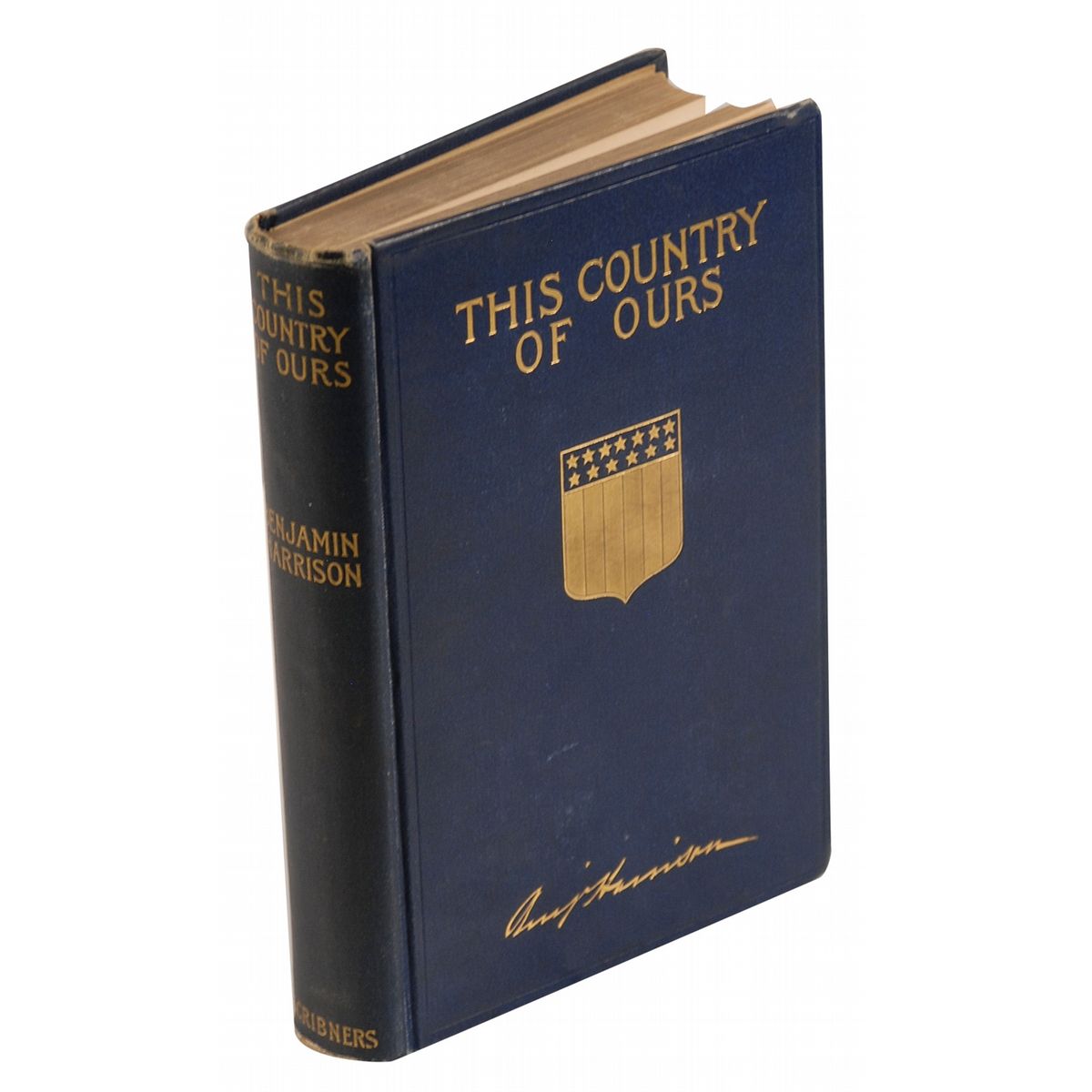 Signed book: This Country of Ours. First edition. NY: Charles Scribner's Sons, 1897. Hardcover, 5.25 x 7.5, 360 pages. Signed on the first free end page, “Very truly yours, Benj. Harrison.” In very good condition, with toning and soiling to signed page, a diagonal crease to signed page and opening pages, toning and soiling to pastedowns, partially separated back hinge, light cover wear and fraying to head and tail of spine. Signed versions of Harrison’s book are rare.
