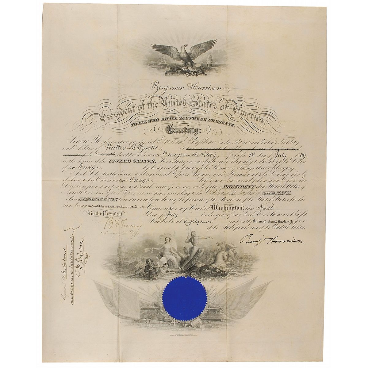 Partly-printed DS as president, signed “Benj Harrison,” one page, 15.5 x 19.5, July 9, 1889. Harrison appoints Walter S. Burke “an Ensign in the Navy.” Signed at the conclusion by Harrison and countersigned by Secretary of the Navy Benjamin F. Tracy. One line of the document has been crossed out, probably due to Congress being in recess at the time. Intersecting folds, and scattered light toning and creasing, otherwise fine condition. The blue seal is worn but intact.