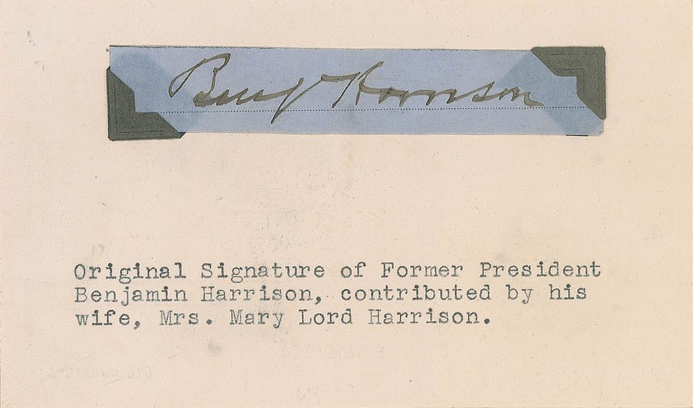 Ink signature, “Benj. Harrison,” on a blue 3.5 x .5 slip clipped from a check. In fine condition.