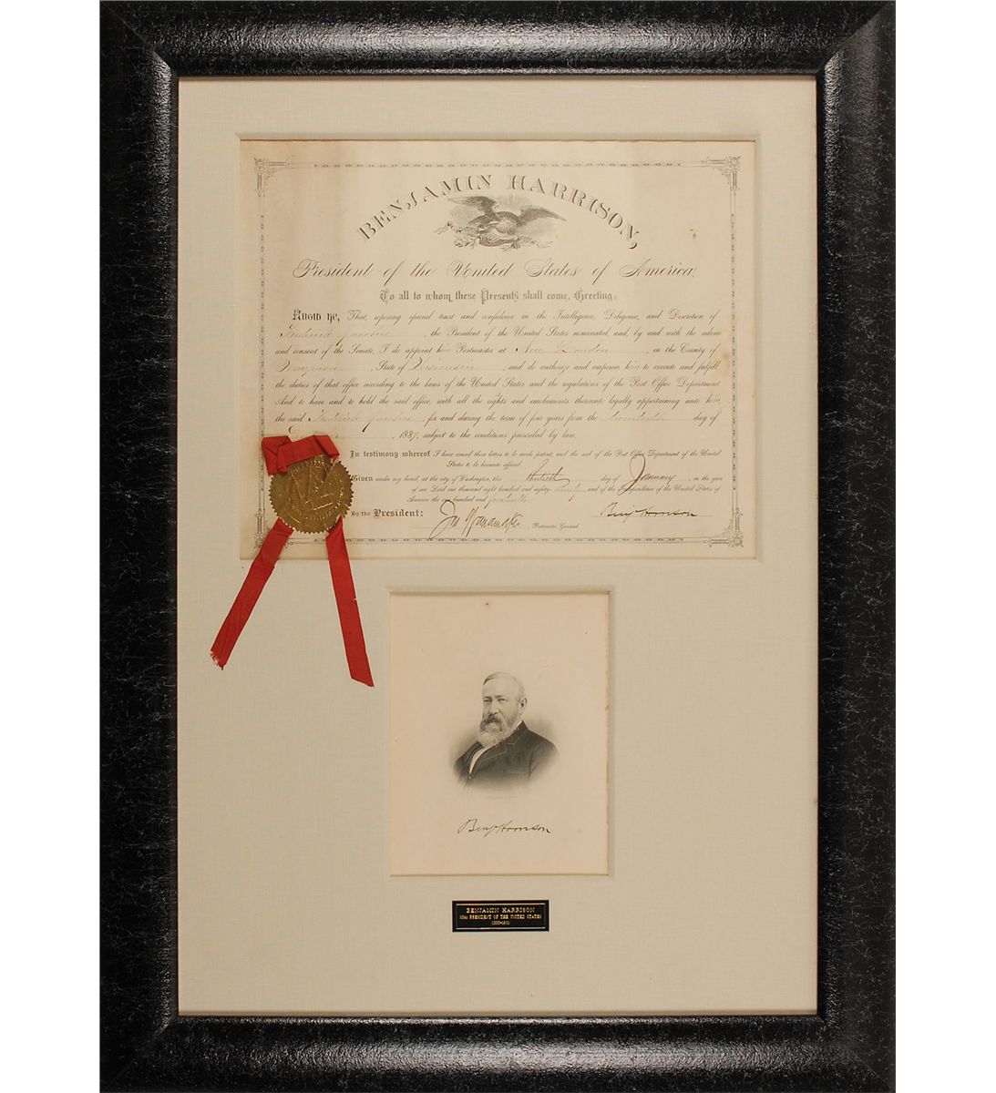 Partly-printed DS as president, signed “Benj Harrison,” one page, 16 x 13.25, January 30, 1889. President Harrison appoints Frederick Jacobus to be postmaster of New London, Wisconsin. Signed at the conclusion by Harrison and countersigned by Postmaster General John Wanamaker. Cloth-matted and framed with an engraved portrait of Harrison and a small plaque to an overall size of 25 x 34. Mild rippling, scattered light toning and soiling, a bit heavier to left side, otherwise fine condition. The gold foil seal has a small tear and is worn, but retains its original red ribbon. Oversized.