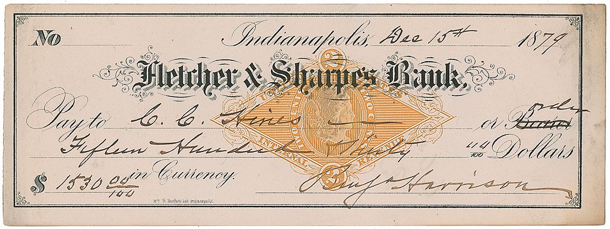 Bank check, 7.75 x 3, filled out and signed by Harrison, “Benj. Harrison,” payable to C. C. Hines for $1530.00, December 15, 1879. Cancellation cut to center and some scattered light toning and soiling, otherwise fine condition.