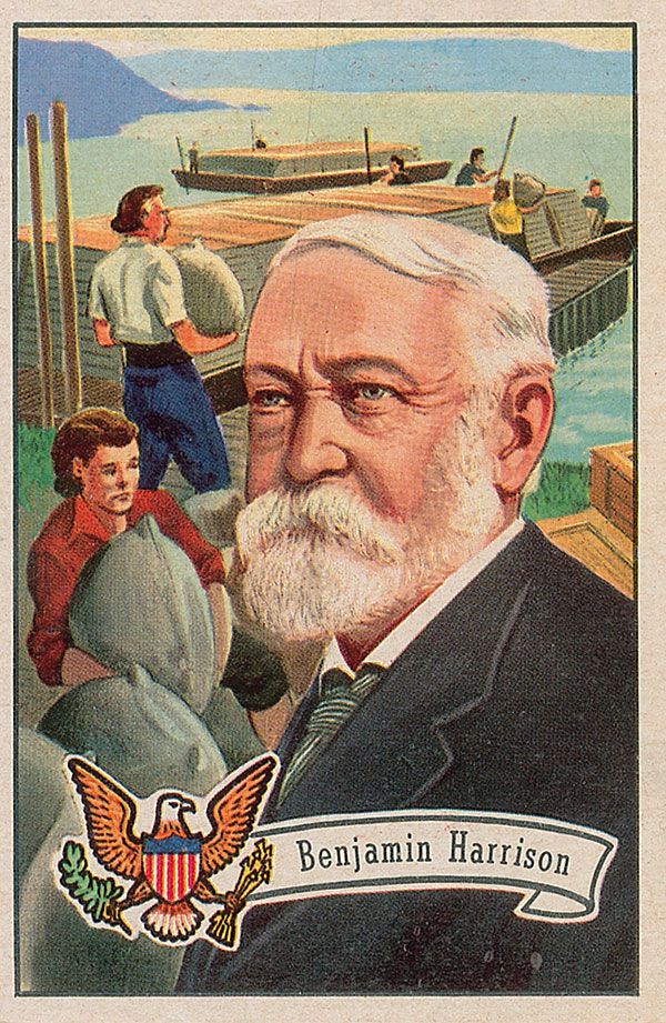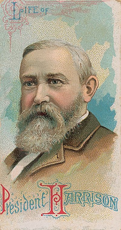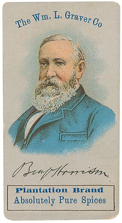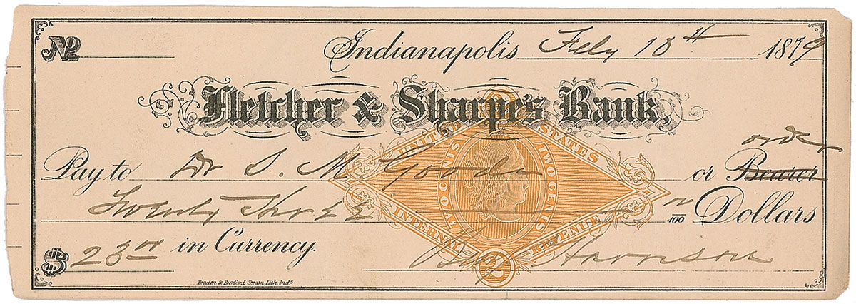 Bank check, 7.75 x 2.75, filled out and signed by Harrison, “Benj. Harrison,” payable to Dr. S. M. Goode for $23, February 10, 1879. In fine condition, with multiple vertical folds (two passing through single letters of the signature), a central cancellation cut, and a few chips to edges. Accompanied by two unsigned tobacco-style cards and one unsigned Topps card featuring Harrison.