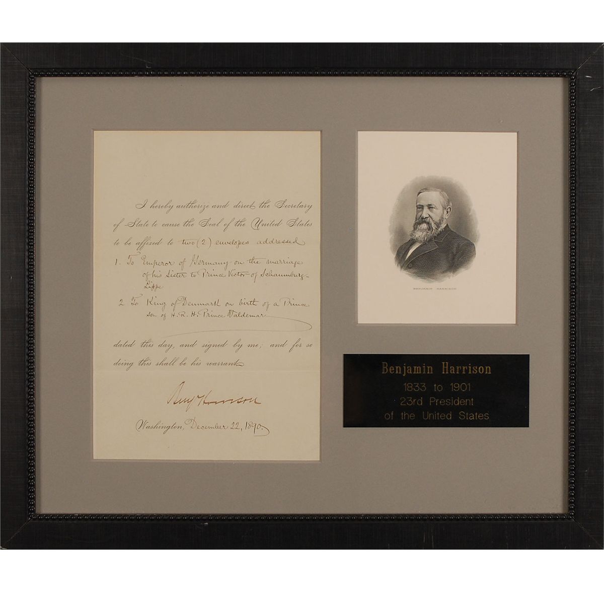 Partly-printed DS as president, signed “Benj. Harrison,” one page, 6 x 8.75, December 22, 1890. Harrison orders the secretary of state to “cause the Seal of the United States to be affixed to two (2) envelopes addressed 1. To Emperor of Germany on the marriage of his Sister to Prince Victor of Schaumburg-Lippe. 2. To King of Denmark on birth of a Prince, son of H. R. H. Prince Waldemar.” Nicely signed at the conclusion by Harrison. Matted and framed with an engraved portrait of Harrison and a small plaque to an overall size of 16 x 13.5. In fine, clean condition.