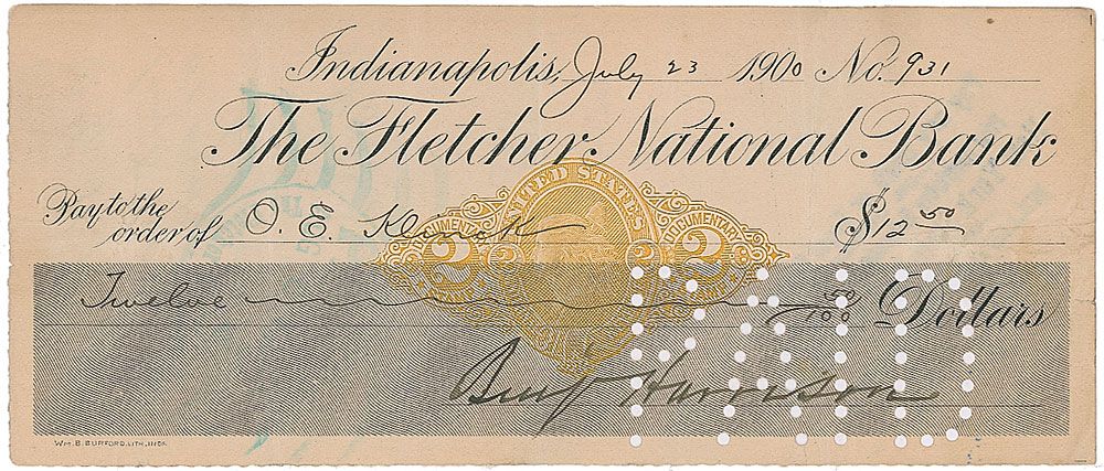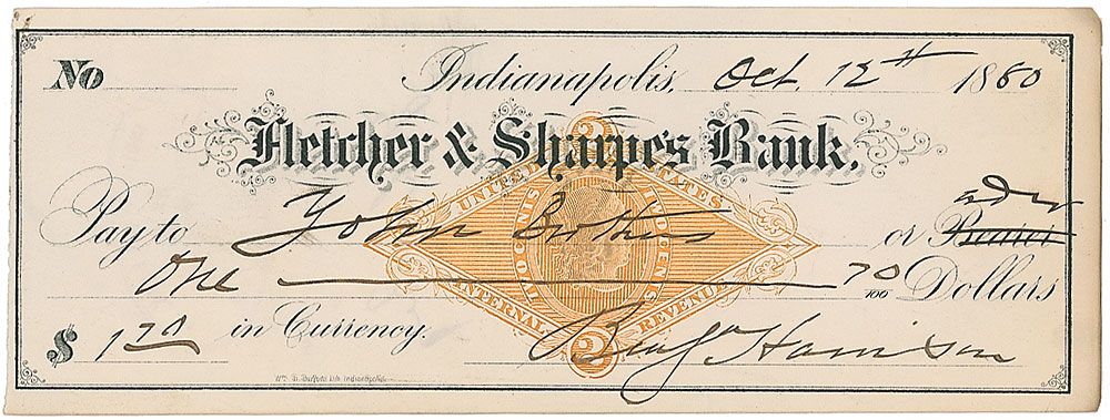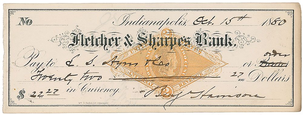 Three bank checks, one filled out in another hand and signed, “Benj. Harrison,” and two filled out and signed by Harrison, “Benj. Harrison,” two from 1880, and one from 1900. In very good condition, with vertical folds to each check, a single cancellation cut to each, and expected stamps.