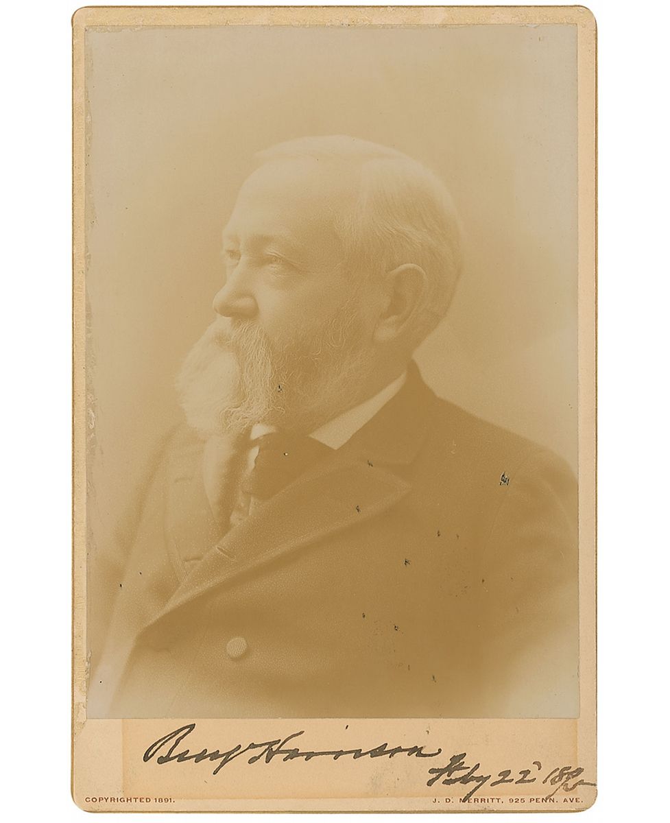 Original glossy 4.25 x 6.25 cabinet photo by Merritt Studios of Washington, D. C., signed on the mount in black ink, “Benj. Harrison, Feby 22, 1895.” Mild block of toning over signature, a few dings and surface marks to image, and mounting remnants along two edges, otherwise fine condition.