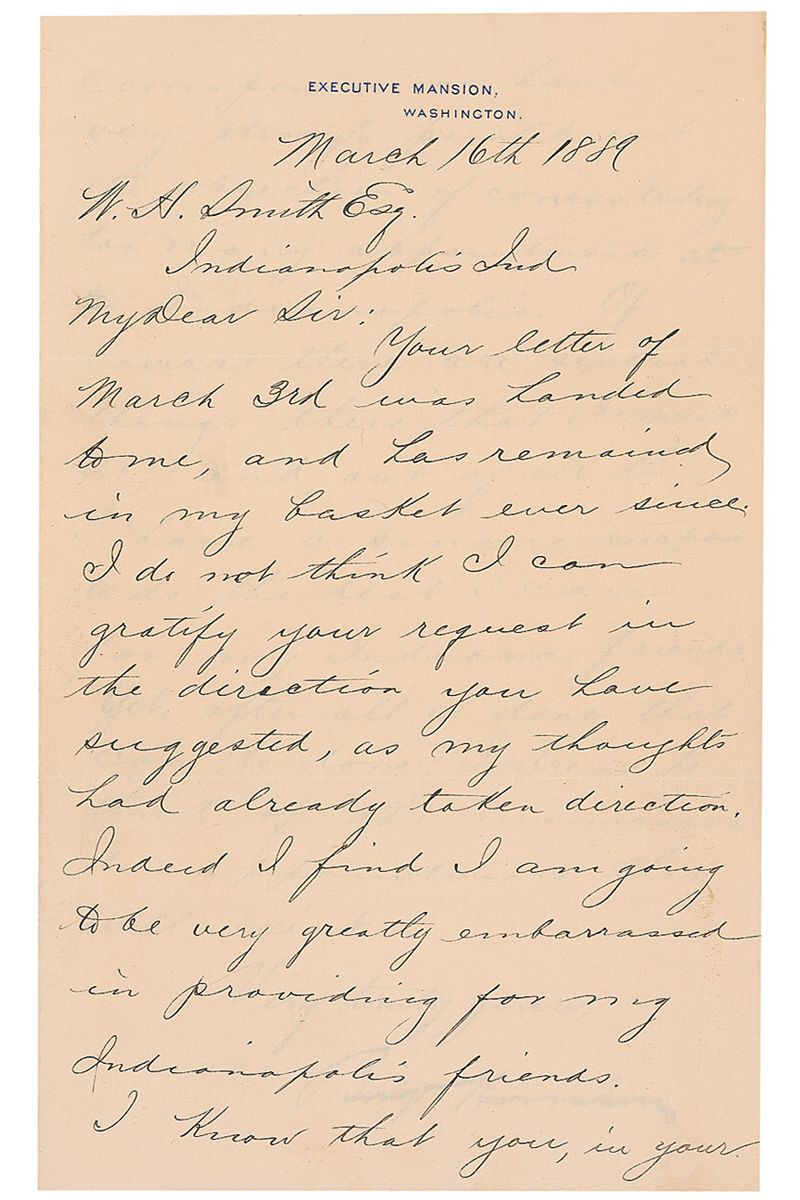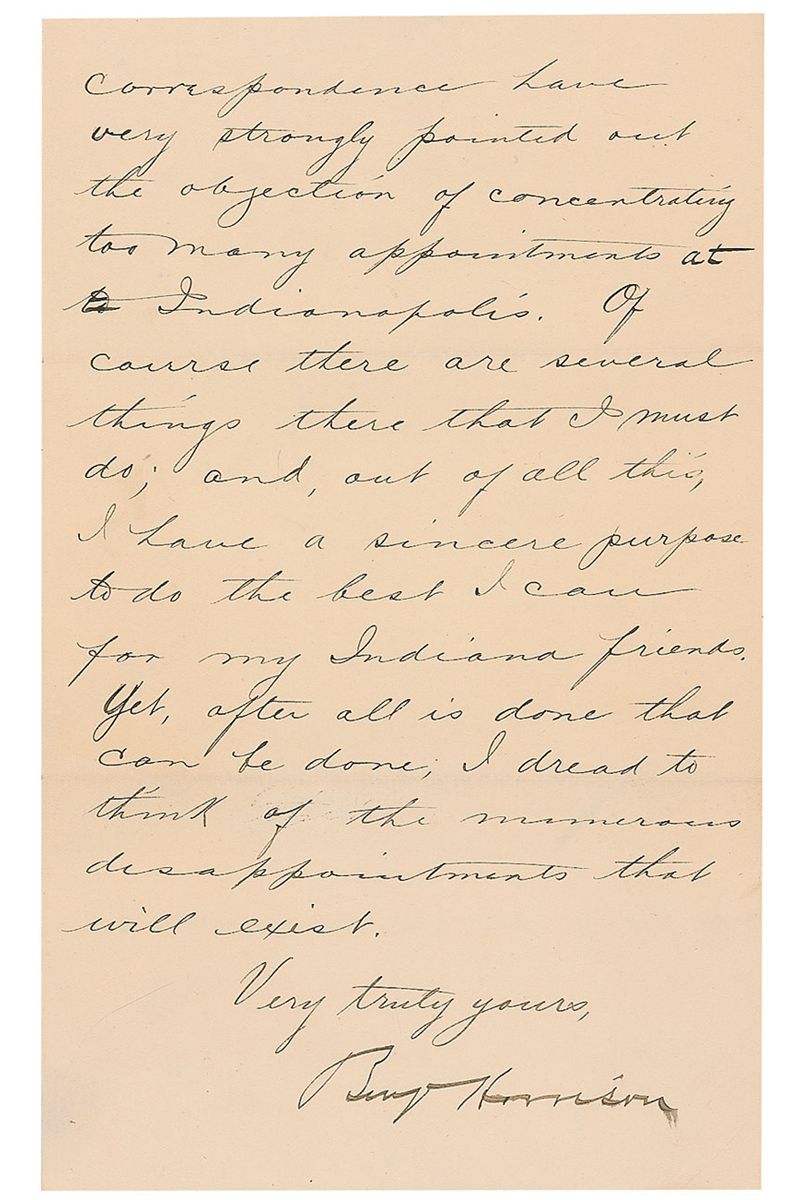 LS as president signed “Benj Harrison,” two pages on two adjoining sheets, 5.5 x 9, Executive Mansion letterhead, March 16, 1889. Letter to W. H. Smith. In part: “I do not think I can gratify your request in the direction you have suggested, as my thoughts had already taken direction. Indeed I find I am going to be very greatly embarrassed in providing for my Indianapolis friends. I know that you, in your correspondence have very strongly pointed out the objection of concentrating too many appointments at Indianapolis. Of course there are several things there that I must do; and, out of all this, I have a sincere purpose to do the best I can for my Indiana friends. Yet, after all is done that can be done, I dread to think of the numerous disappointments that will exist.” In fine condition. This letter was written just twelve days after Harrison’s March 4th, 1889 inauguration.