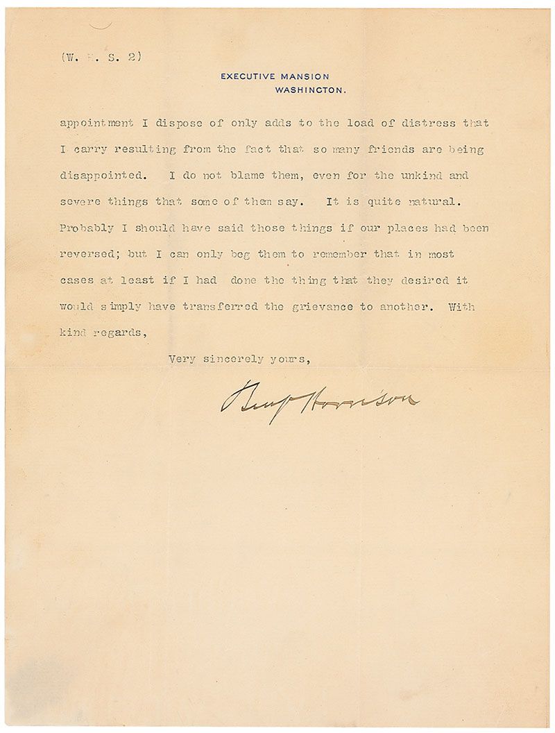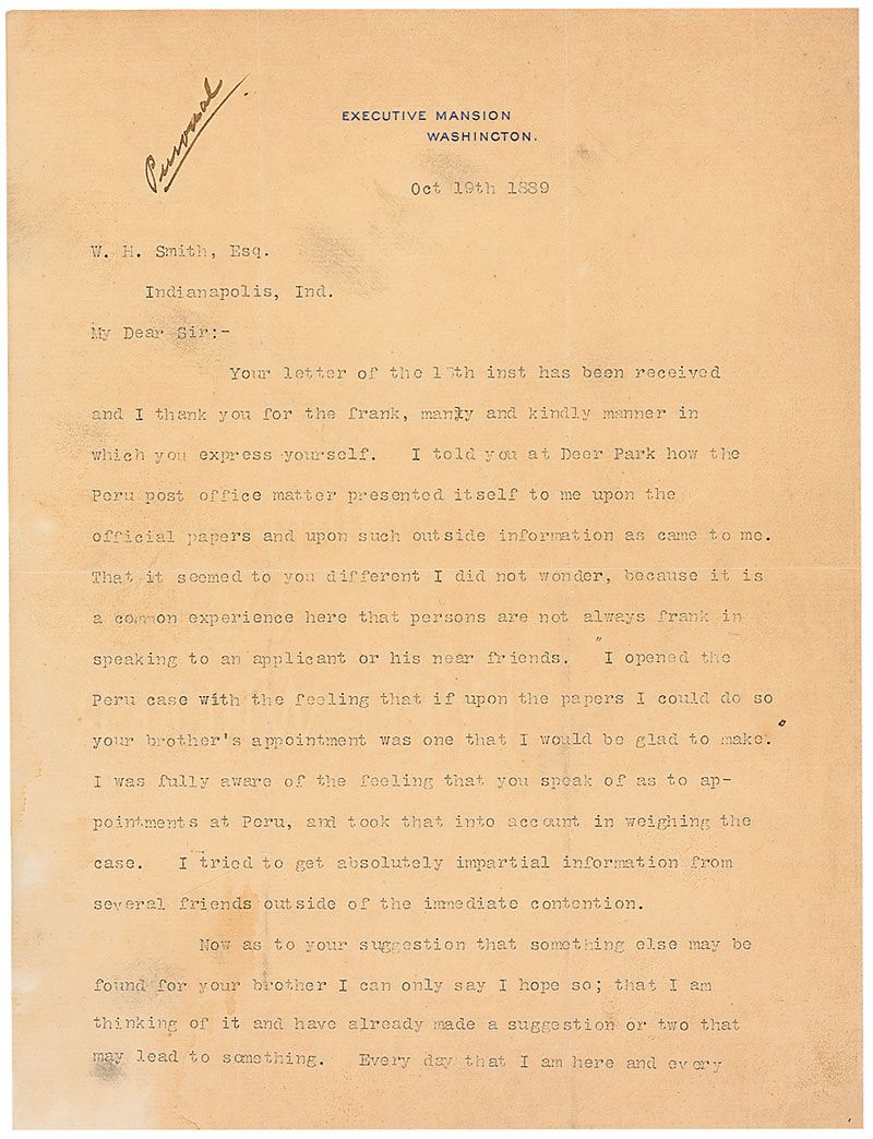 TLS as president signed “Benj Harrison,” two pages, 8 x 10.25, Executive Mansion letterhead, October 19, 1889. Letter to W. H. Smith, marked at the top, “Personal.” In full: “Your letter of the 15th inst has been received and I thank you for the frank, manly and kindly manner in which you express yourself. I told you at Deer Park how the Peru post office matter presented itself to me upon the official papers and upon such outside information as came to me. That it seemed to you different I did not wonder, because it is a common experience here that persons are not always frank in speaking to an applicant or his near friends. I opened the Peru case with the feeling that if upon the papers I could do so your brother’s appointment was one that I would be glad to make. I was fully aware of the feeling that you speak of as to appointments at Peru, and took into account in weighing the case. I tried to get absolutely impartial information from several friends outside of the immediate contention.