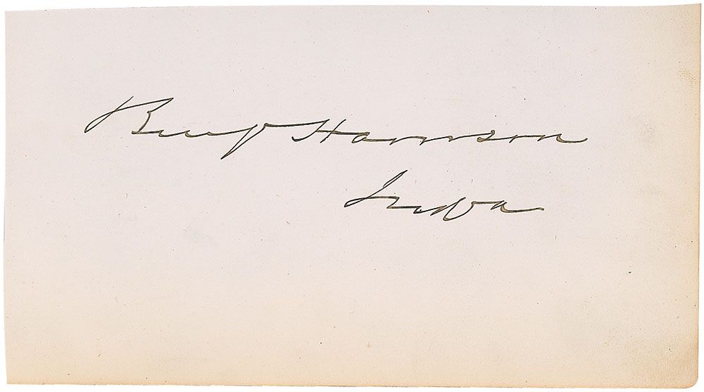 Crisp ink signature, “Benj. Harrison, Inda,” on an off-white 6.5 x 3.5 sheet. In fine condition.