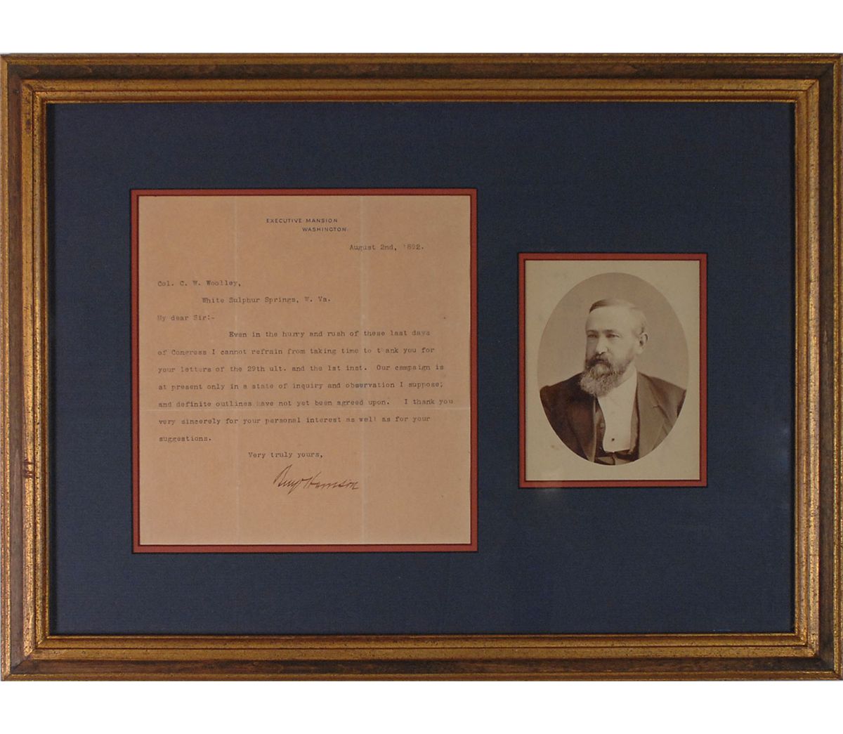TLS as president signed “Benj. Harrison,” one page, 7.25 x 8, Executive Mansion letterhead, August 2, 1892. The president writes Colonel C. W. Woolley of White Sulpher Springs, West Virginia. In part: “Even in the hurry and rush of these last days of Congress I cannot refrain from taking time to thank you for your letters…Our campaign is at present only in a state of inquiry and observation I suppose; and definitely outlines have not yet been agreed upon. I thank you very sincerely for your personal interest as well as for your suggestions.” Double-matted and framed with an oval cabinet photograph to an overall size of 19 x 14. In very good condition, with few creases, intersecting folds, and moderate uniform overall toning. Accompanied by a full letter of authenticity from PSA/DNA.