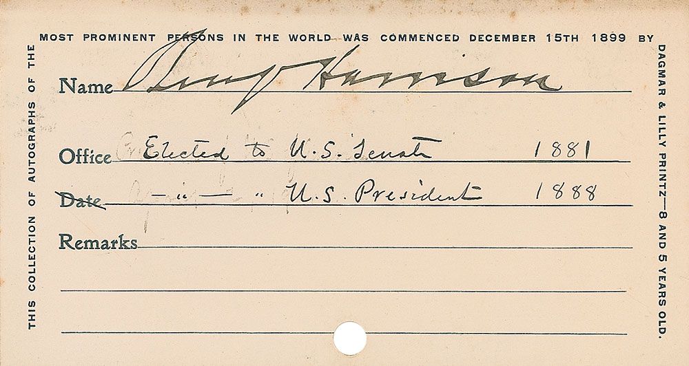 Ink signature, “Benj. Harrison,” on an off-white 4.75 x 2.5 custom-made card for the collection of Dagmar and Lilly Printz, with biographical notations by the collector under the signature. In fine condition, with some scattered mild toning and a punch hole to bottom edge.