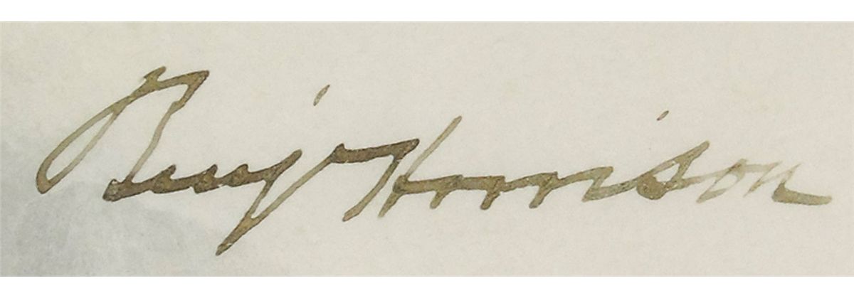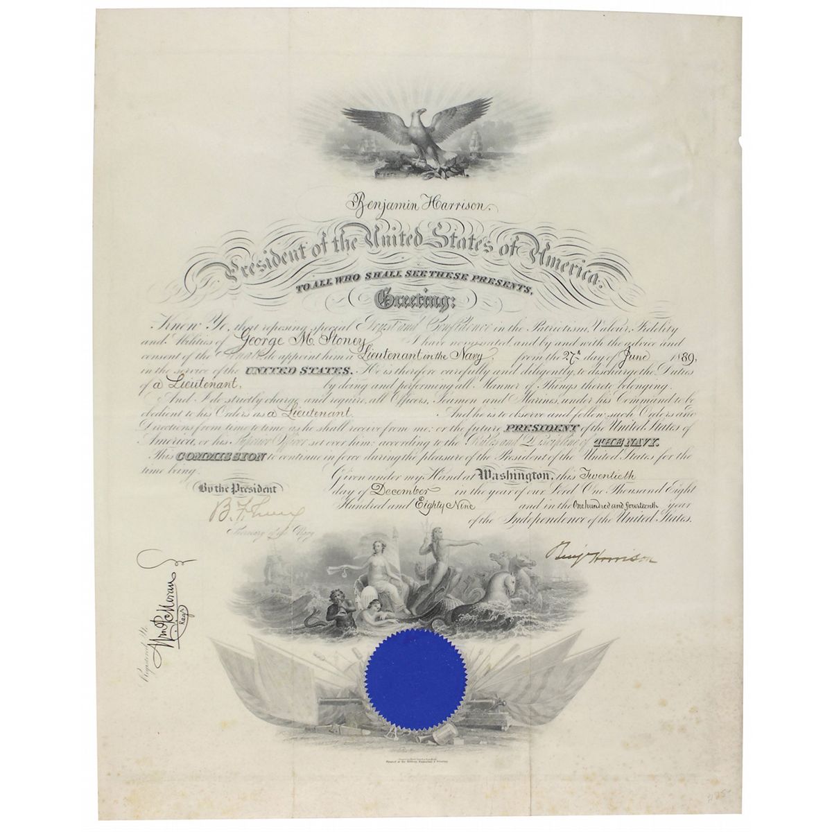 Partly-printed vellum DS as president, signed “Benj. Harrison,” one page, 15.75 x 19.5, December 20, 1889. President Harrison appoints George M. Stoney as “a Lieutenant in the Navy.” Boldly signed at the conclusion by Harrison and countersigned by Secretary of the Navy Benjamin F. Tracy. Blue seal affixed to the lower portion remains crisp and fully intact. In fine condition, with intersecting folds and scattered foxing towards the bottom.