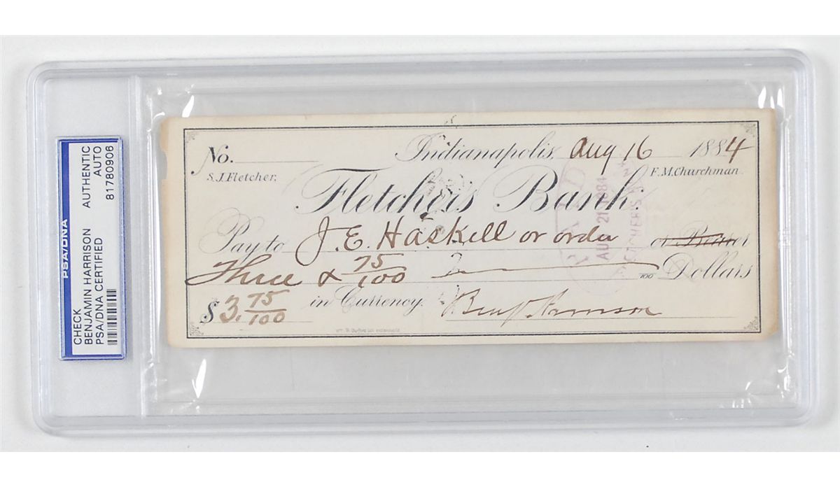 Bank check, 7.25 x 2.75, filled out in another hand and signed by Harrison, payable to J. E. Haskell or order for $3.75, August 16, 1884. Encapsulated in a plastic PSA/DNA authentication holder. Three vertical folds, one through a single letter of signature, cancellation cut above signature, and expected stamps, otherwise fine condition.